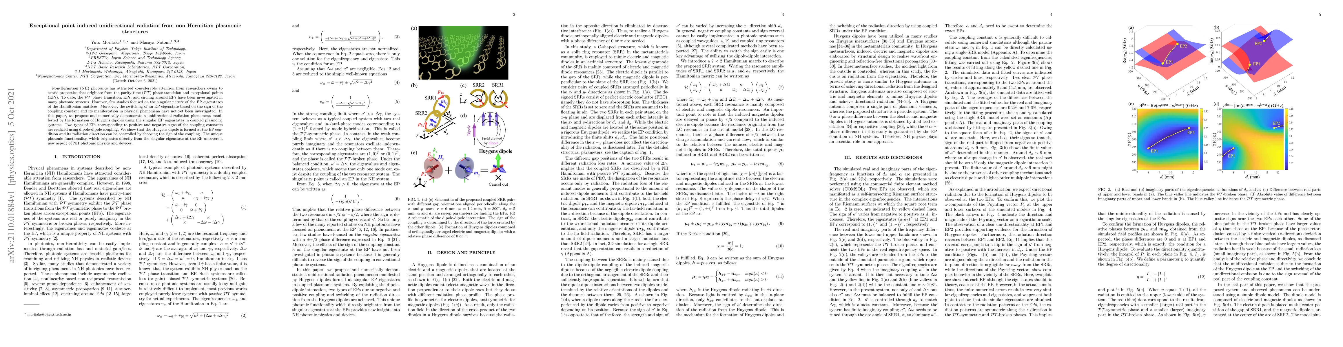 Non-Hermitian (NH) photonics has attracted considerable attention from researchers owing to exotic properties that originate from the parity-time ($\mathcal{PT}$) phase transition and exceptional points (EPs). To date, the $\mathcal{PT}$ phase transition, EPs, and circling around EPs have been investigated in many photonic systems. However, few studies focused on the singular nature of the EP eigenstates of the Hamiltonian matrices. Moreover, the switching of an EP eigenstate based on the sign of the coupling constant and its manifestation in physical phenomena have not yet been investigated. In this paper, we propose and numerically demonstrate a unidirectional radiation phenomena manifested by the formation of Huygens dipoles using the singular EP eigenstates in coupled plasmonic systems. Two types of EPs corresponding to positive and negative signs of the coupling constants are realized using dipole-dipole coupling. We show that the Huygens dipole is formed at the EP condition and its radiation direction can be controlled by choosing the sign of the coupling. The unique photonic functionality, which originates directly from the singular eigenstate at the EP uncovers a new aspect of NH photonic physics and devices.