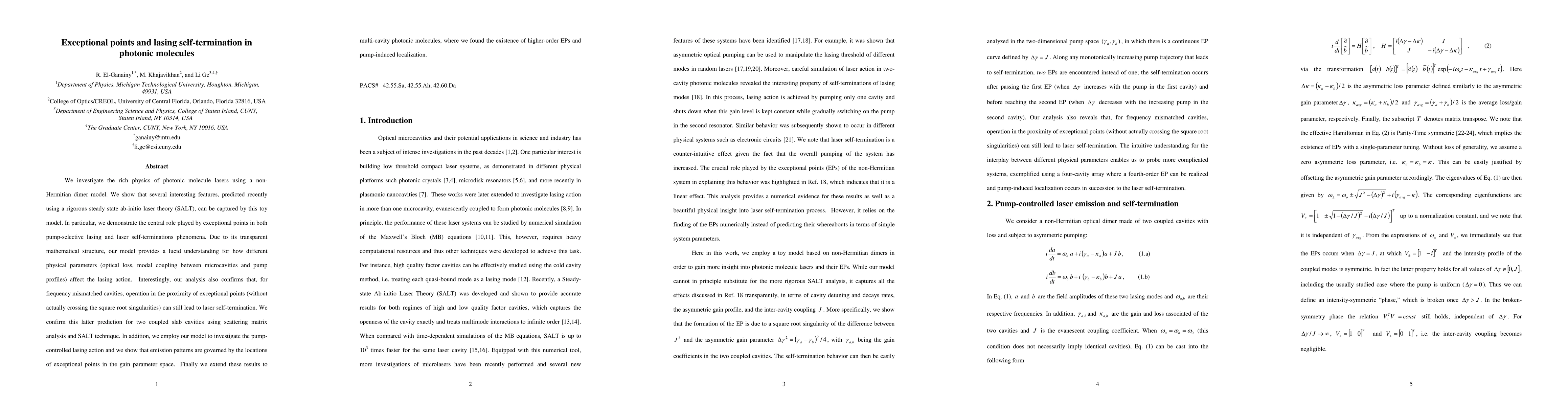 This paper explores photonic molecule lasers using a non-Hermitian dimer model, demonstrating the role of exceptional points in lasing and self-termination. It confirms that proximity to exceptional points can induce laser self-termination without crossing singularities, and extends findings to multi-cavity systems.