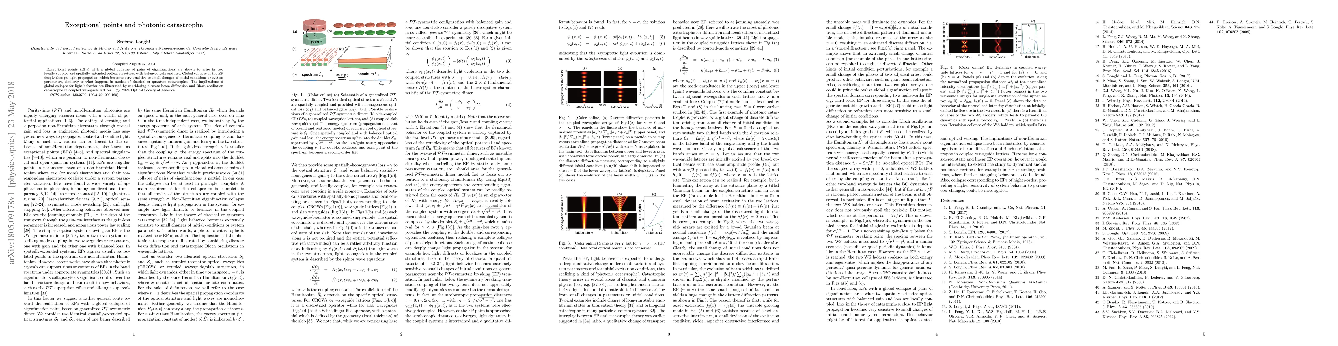 Exceptional points (EPs) with a global collapse of pairs of eigenfunctions are shown to arise in two locally-coupled and spatially-extended optical structures with balanced gain and loss. Global collapse at the EP deeply changes light propagation, which becomes very sensitive to small changes of initial conditions or system parameters, similarly to what happens in models of classical or quantum catastrophes. The implications of global collapse for light behavior are illustrated by considering discrete beam diffraction and Bloch oscillation catastrophe in coupled waveguide lattices.