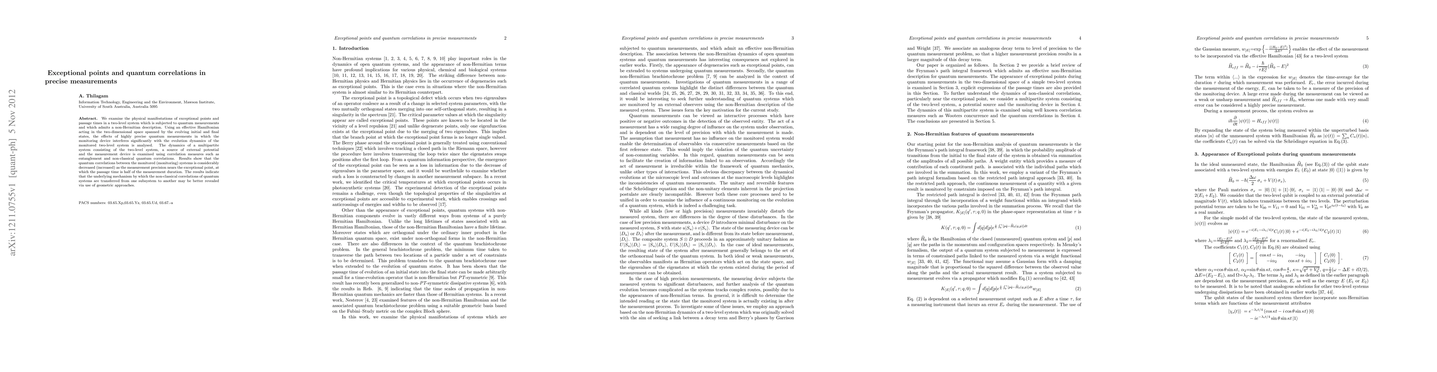 We examine the physical manifestations of exceptional points and passage times in a two-level system which is subjected to quantum measurements and which admits a non-Hermitian description. Using an effective Hamiltonian acting in the two-dimensional space spanned by the evolving initial and final states, the effects of highly precise quantum measurements in which the monitoring device interferes significantly with the evolution dynamics of the monitored two-level system is analysed. The dynamics of a multipartite system consisting of the two-level system, a source of external potential and the measurement device is examined using correlation measures such as entanglement and non-classical quantum correlations. Results show that the quantum correlations between the monitored (monitoring) systems is considerably decreased (increased) as the measurement precision nears the exceptional point, at which the passage time is half of the measurement duration. The results indicate that the underlying mechanism by which the non-classical correlations of quantum systems are transferred from one subsystem to another may be better revealed via use of geometric approaches.