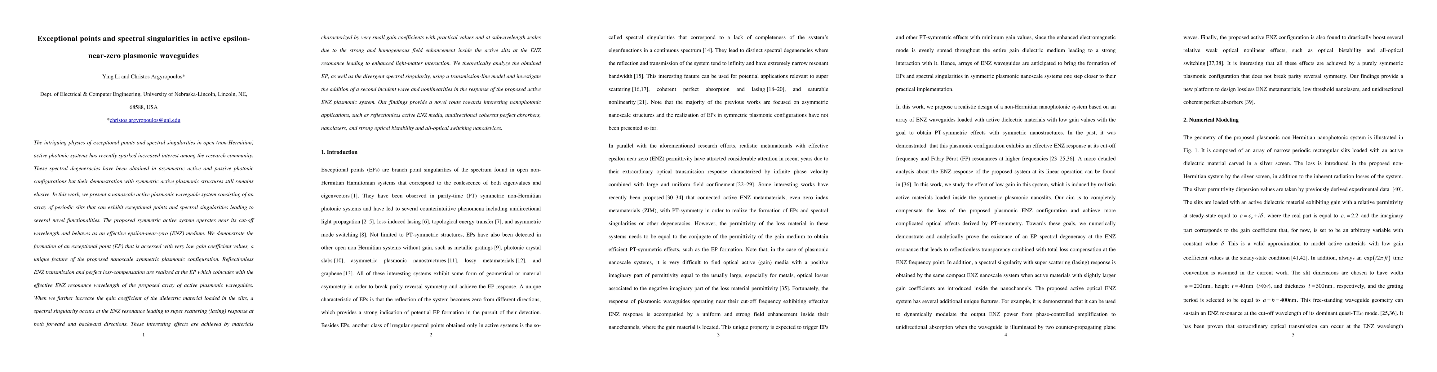 The paper presents a novel active plasmonic waveguide system that exhibits exceptional points and spectral singularities near the cut-off wavelength, operating as an effective epsilon-near-zero medium, and demonstrates unique functionalities like reflectionless transmission, loss compensation, and enhanced nonlinear effects.