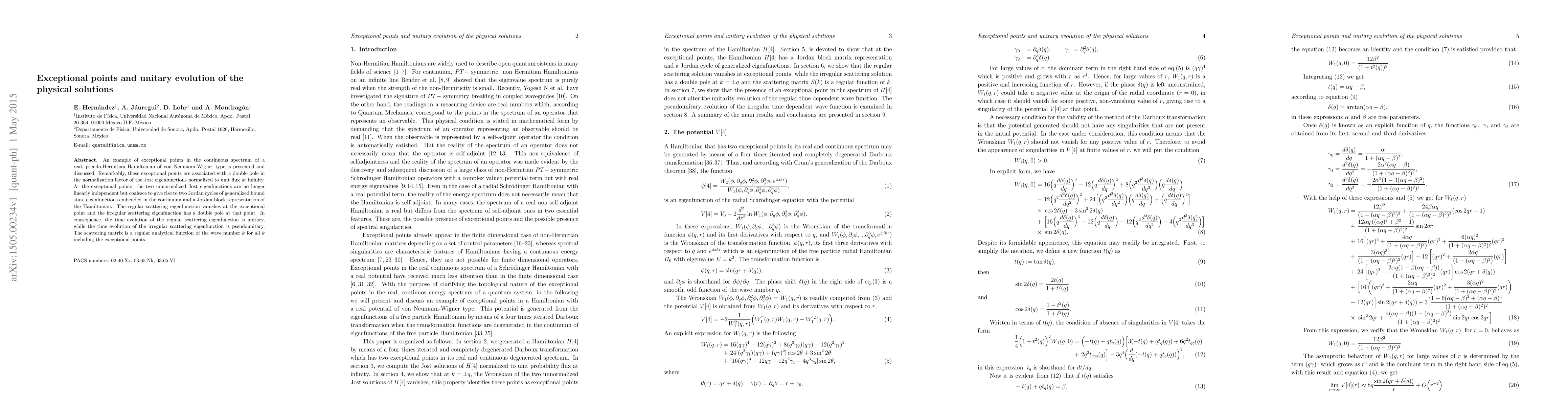 An example of exceptional points in the continuous spectrum of a real, pseudo-Hermitian Hamiltonian of von Neumann-Wigner type is presented and discussed. Remarkably, these exceptional points are associated with a double pole in the normalization factor of the Jost eigenfunctions normalized to unit flux at infinity. At the exceptional points, the two unnormalized Jost eigenfunctions are no longer linearly independent but coalesce to give rise to two Jordan cycles of generalized bound state eigenfunctions embedded in the continuum and a Jordan block representation of the Hamiltonian. The regular scattering eigenfunction vanishes at the exceptional point and the irregular scattering eigenfunction has a double pole at that point. In consequence, the time evolution of the regular scattering eigenfunction is unitary, while the time evolution of the irregular scattering eigenfunction is pseudounitary. The scattering matrix is a regular analytical function of the wave number $k$ for all $k$ including the exceptional points.