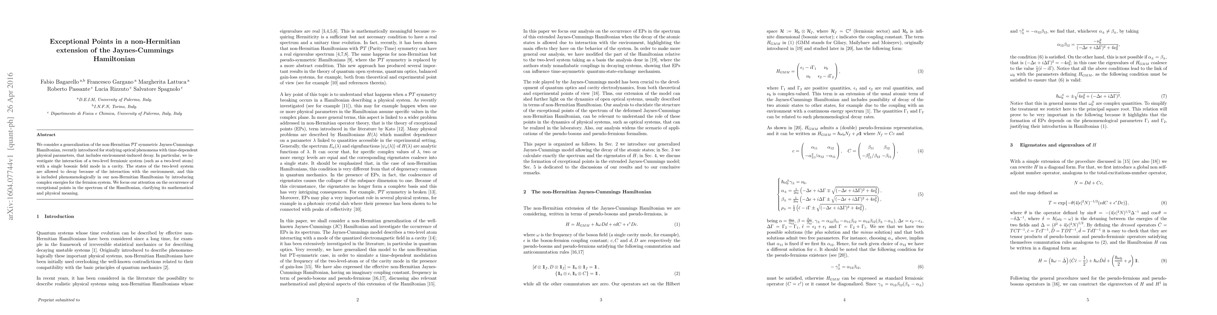 This paper studies a non-Hermitian extension of the Jaynes-Cummings Hamiltonian to include environment-induced decay, focusing on the interaction between a two-level fermionic system and a bosonic field mode. It investigates the occurrence of exceptional points in the Hamiltonian's spectrum, elucidating their mathematical and physical implications.