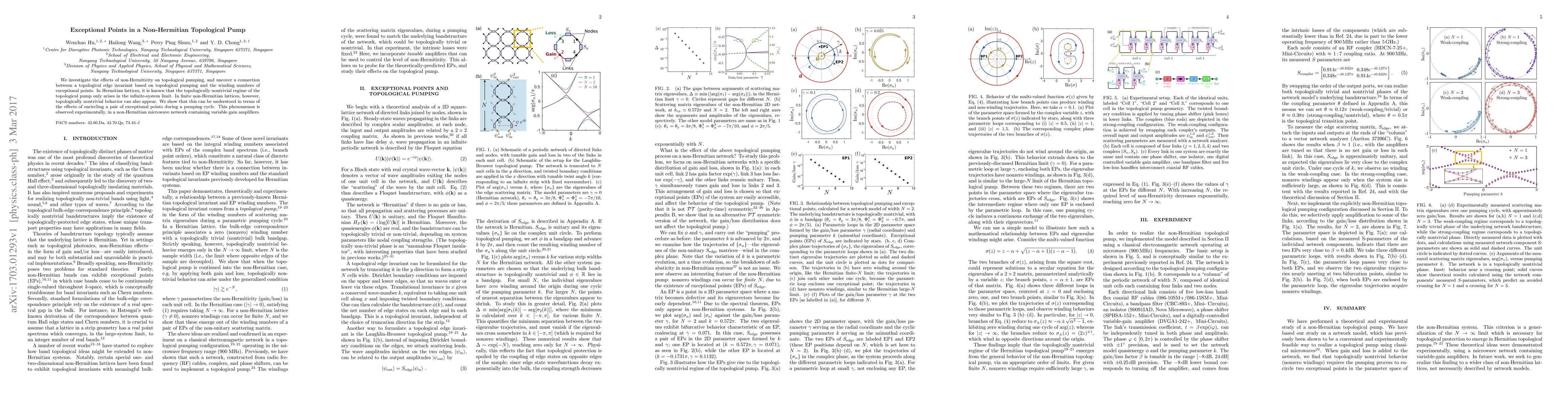 The paper presents a theoretical and experimental investigation of non-Hermitian topological pumping, revealing the connection between topological edge invariants and winding numbers of exceptional points, and demonstrating experimental evidence in a non-Hermitian microwave network.