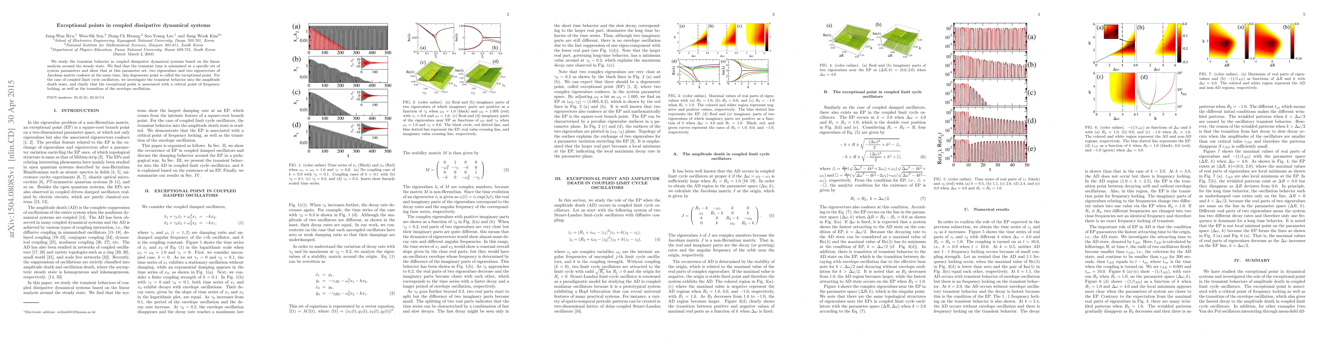 This paper investigates transient behavior in coupled dissipative dynamical systems, identifying an exceptional point where two eigenvalues and eigenvectors coalesce, minimizing transient time. For coupled limit cycle oscillators, this exceptional point correlates with critical frequency locking and envelope oscillation transitions.