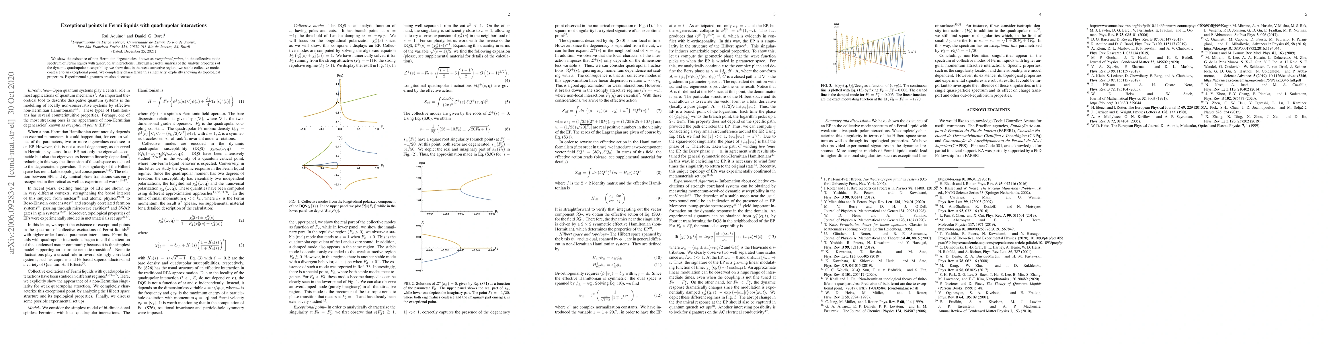 We show the existence of non-Hermitian degeneracies, known as exceptional points, in the collective mode spectrum of Fermi liquids with quadrupolar interactions. Through a careful analysis of the analytic properties of the dynamic quadrupolar susceptibility, we show that, in the weak attractive region, two stable collective modes coalesce to an exceptional point. We completely characterize this singularity, explicitly showing its topological properties. Experimental signatures are also discussed.