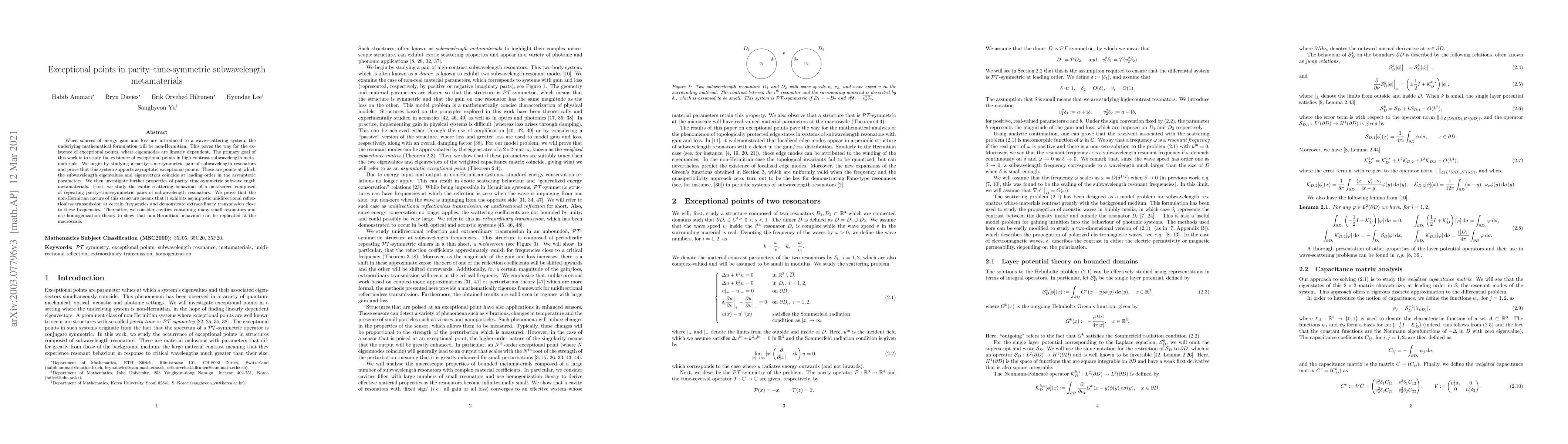 This paper explores the emergence of exceptional points in non-Hermitian systems within parity-time-symmetric subwavelength metamaterials, demonstrating unidirectional reflectionless transmission and extraordinary transmission properties, and showing how these effects can be homogenized at a macroscale.