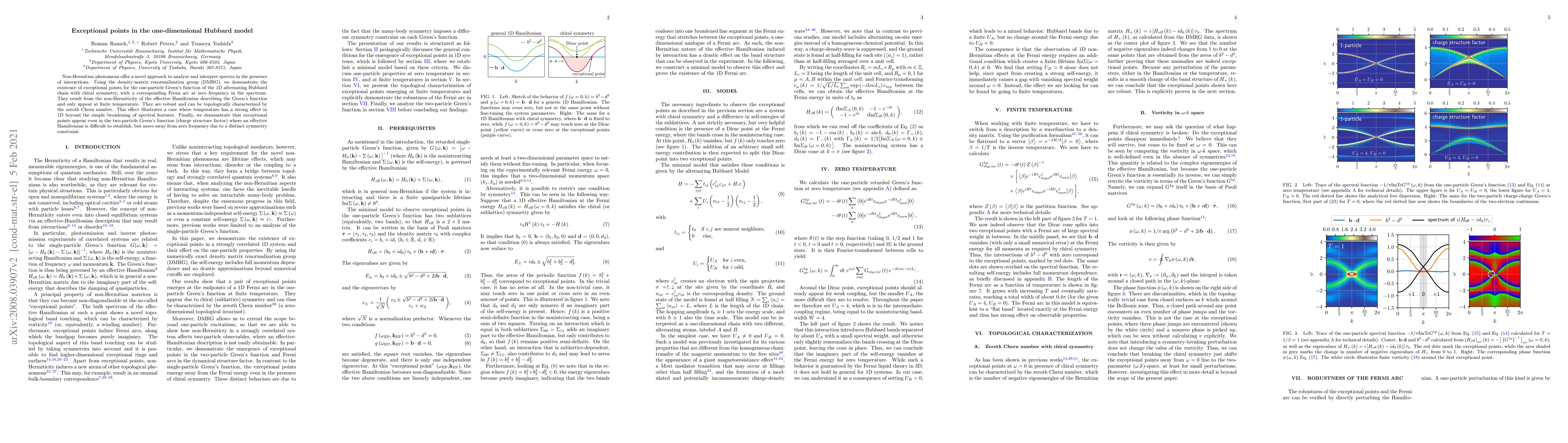 Non-Hermitian phenomena offer a novel approach to analyze and interpret spectra in the presence of interactions. Using the density-matrix renormalization group (DMRG), we demonstrate the existence of exceptional points for the one-particle Green's function of the 1D alternating Hubbard chain with chiral symmetry, with a corresponding Fermi arc at zero frequency in the spectrum. They result from the non-Hermiticity of the effective Hamiltonian describing the Green's function and only appear at finite temperature. They are robust and can be topologically characterized by the zeroth Chern number. This effect illustrates a case where temperature has a strong effect in 1D beyond the simple broadening of spectral features. Finally, we demonstrate that exceptional points appear even in the two-particle Green's function (charge structure factor) where an effective Hamiltonian is difficult to establish, but move away from zero frequency due to a distinct symmetry constraint.