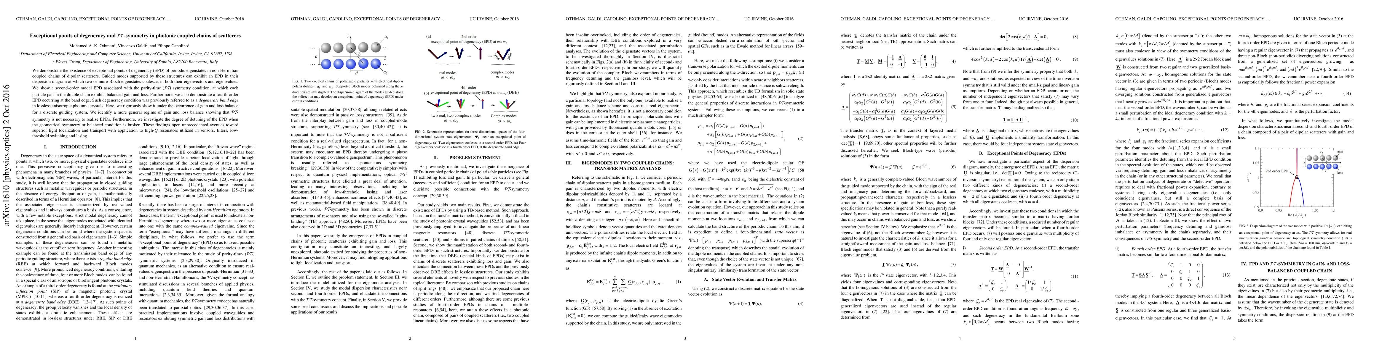 This paper demonstrates exceptional points of degeneracy (EPD) in photonic coupled scatterer chains, showing how guided modes can coalesce at EPDs linked to $\cal{PT}$-symmetry. It reveals that EPDs can occur without $\cal{PT}$-symmetry and explores the effects of detuning on these points, suggesting applications in advanced optical devices like sensors and filters.