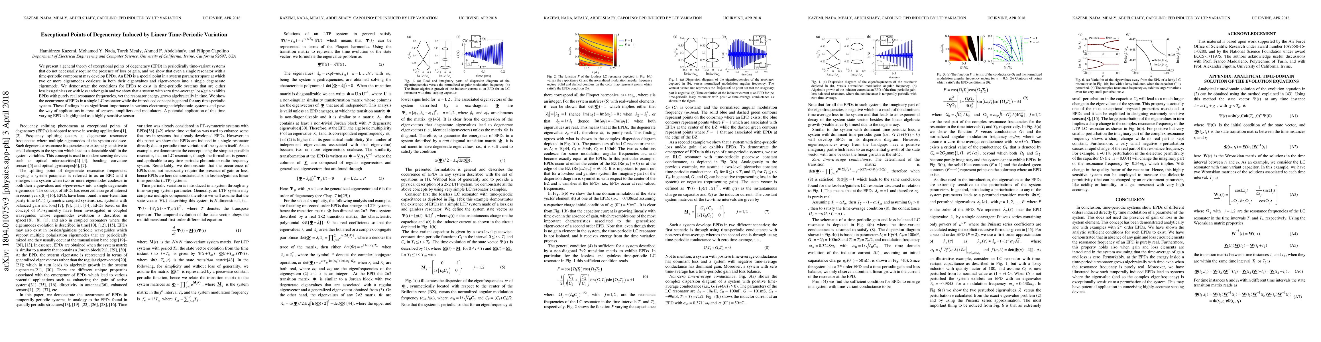 This paper develops a theory for exceptional points of degeneracy (EPD) in time-periodic systems, showing that EPDs can occur without loss or gain in a single resonator. The findings suggest significant applications in sensors, amplifiers, and modulators, with a highlighted potential for highly-sensitive sensing.