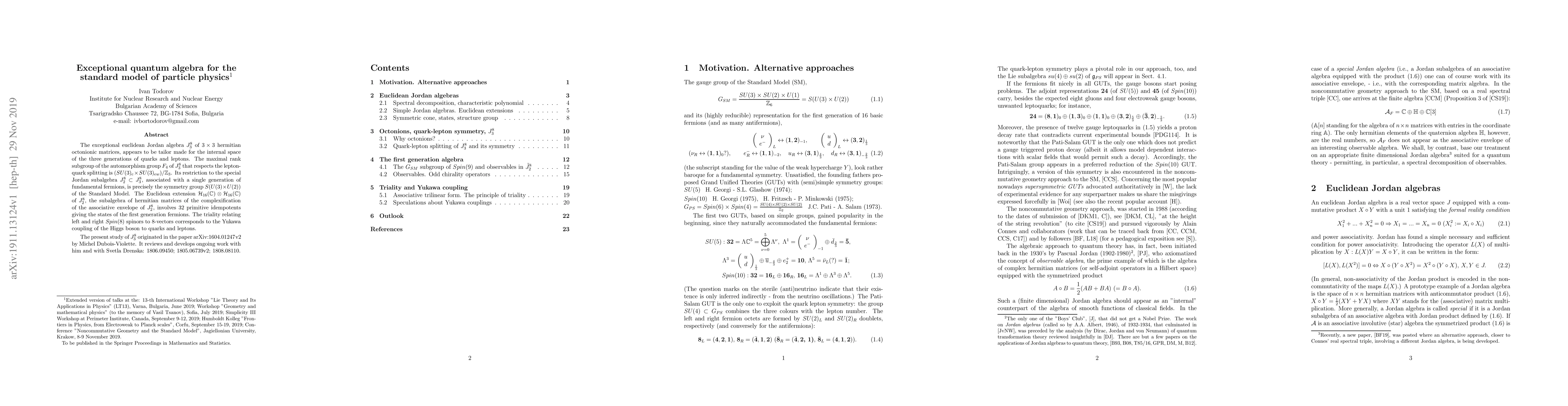 This paper explores how the exceptional Euclidean Jordan algebra of 3x3 hermitian octonionic matrices can be used to describe the internal space of the Standard Model's three quark and lepton generations, aligning with the symmetry group of the Standard Model and providing a framework for Yukawa couplings.