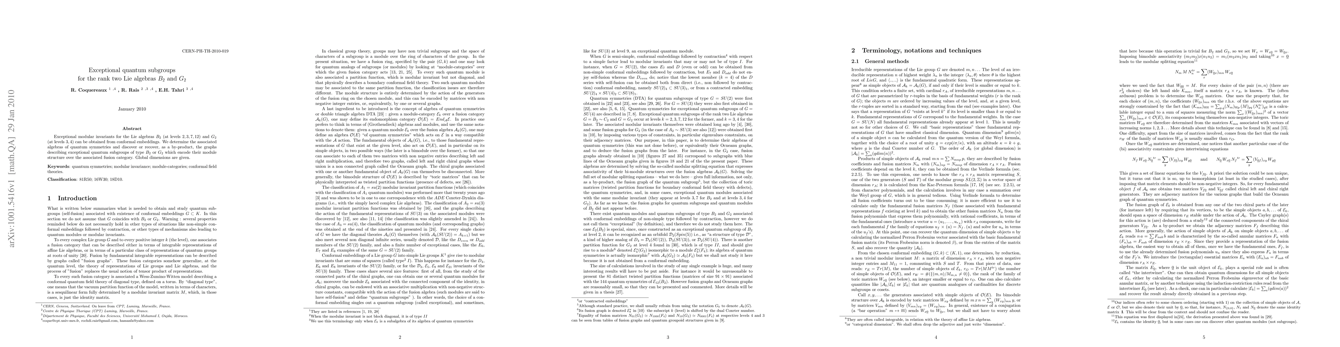 This paper investigates exceptional quantum subgroups for the rank two Lie algebras B2 and G2, deriving modular invariants from conformal embeddings and determining the associated algebras of quantum symmetries. The study uncovers graphs describing exceptional quantum subgroups that encode module structure and provides their global dimensions.