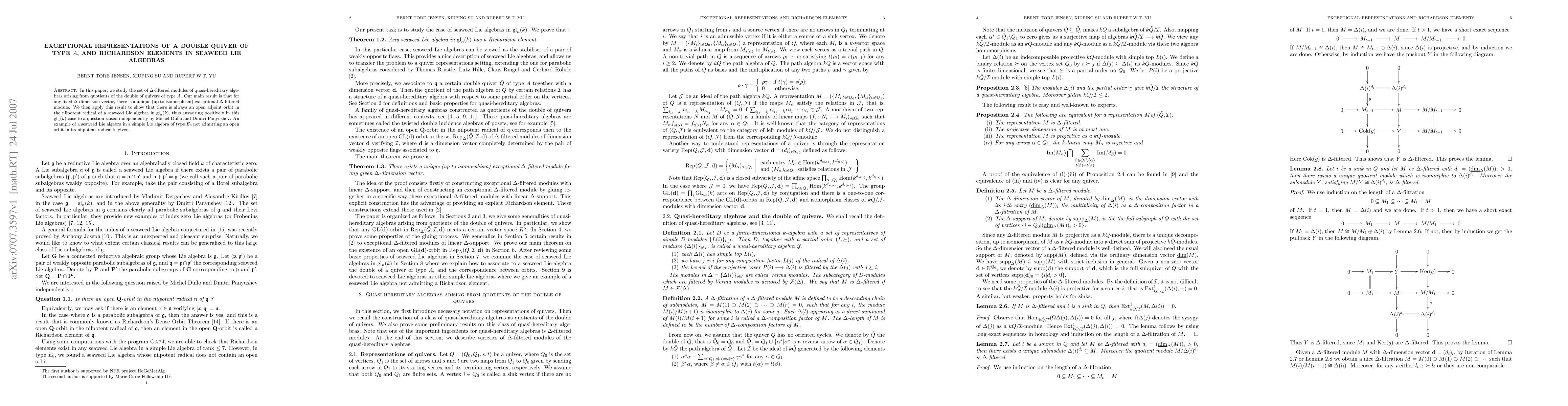Researchers discovered a unique exceptional representation of a double quiver for every fixed dimension vector in seaweed Lie algebras, leading to the existence of an open adjoint orbit in its nilpotent radical.