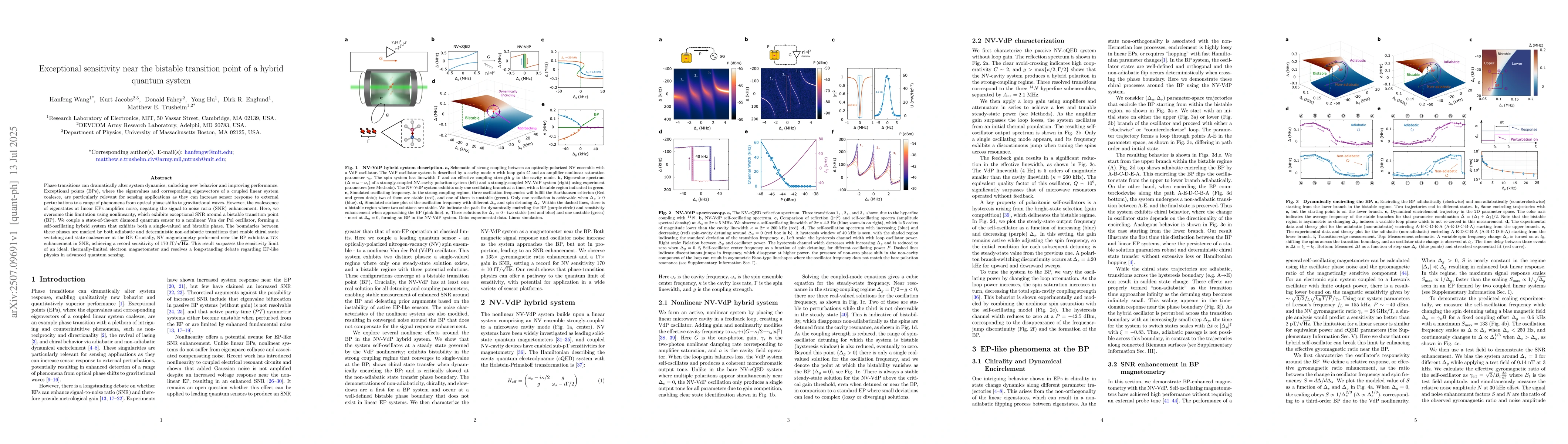 Phase transitions can dramatically alter system dynamics, unlocking new behavior and improving performance. Exceptional points (EPs), where the eigenvalues and corresponding eigenvectors of a coupled linear system coalesce, are particularly relevant for sensing applications as they can increase sensor response to external perturbations to a range of phenomena from optical phase shifts to gravitational waves. However, the coalescence of eigenstates at linear EPs amplifies noise, negating the signal-to-noise ratio (SNR) enhancement. Here, we overcome this limitation using nonlinearity, which exhibits exceptional SNR around a bistable transition point (BP). We couple a state-of-the-art diamond quantum sensor to a nonlinear Van der Pol oscillator, forming a self-oscillating hybrid system that exhibits both a single-valued and bistable phase. The boundaries between these phases are marked by both adiabatic and deterministic non-adiabatic transitions that enable chiral state switching and state coalescence at the BP. Crucially, NV magnetometry performed near the BP exhibits a 17x enhancement in SNR, achieving a record sensitivity of 170 fT/\sqrt{Hz}. This result surpasses the sensitivity limit of an ideal, thermally-limited electron magnetometer and resolves a long-standing debate regarding EP-like physics in advanced quantum sensing.