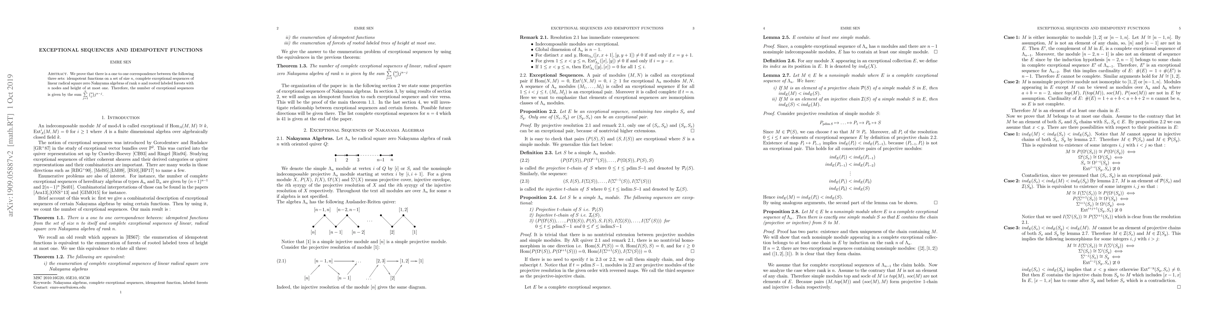 Summary: The paper establishes a one-to-one correspondence between idempotent functions on an $n$-element set, complete exceptional sequences in certain Nakayama algebras, and rooted labeled forests with $n$ nodes and height at most one. The total number of exceptional sequences is calculated as $\sum\limits^n_{j=1}\binom{n}{j}j^{n-j}$.