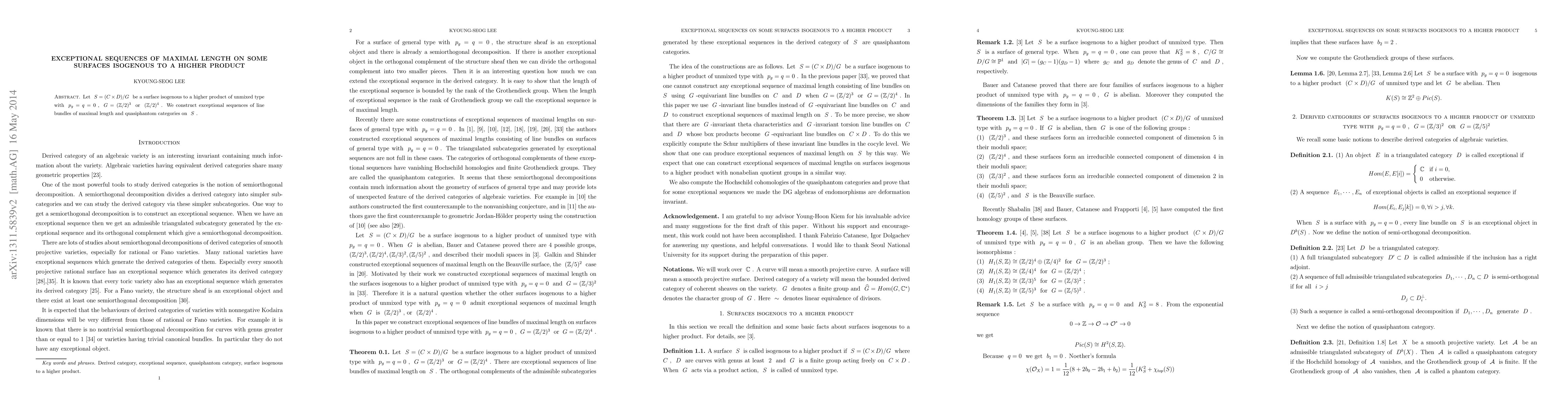 This paper constructs exceptional sequences of maximal length and quasiphantom categories on a specific type of surface $S$, which is isogenous to a higher product with certain properties, using group actions. These sequences are fundamental in understanding the geometry and structure of the surface.