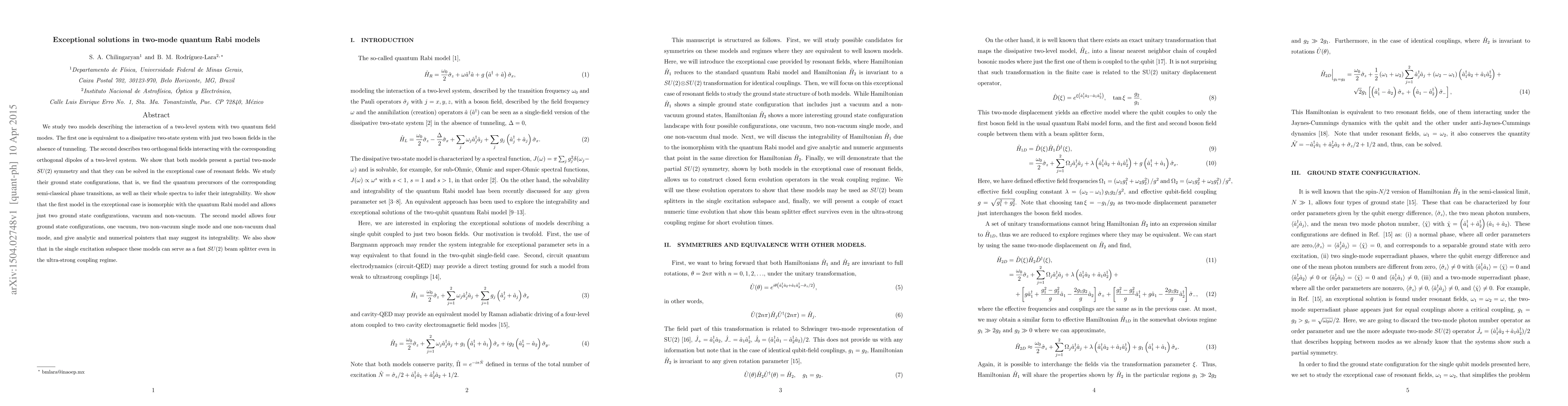 We study two models describing the interaction of a two-level system with two quantum field modes. The first one is equivalent to a dissipative two-state system with just two boson fields in the absence of tunneling. The second describes two orthogonal fields interacting with the corresponding orthogonal dipoles of a two-level system. We show that both models present a partial two-mode $SU(2)$ symmetry and that they can be solved in the exceptional case of resonant fields. We study their ground state configurations, that is, we find the quantum precursors of the corresponding semi-classical phase transitions, as well as their whole spectra to infer their integrability. We show that the first model in the exceptional case is isomorphic with the quantum Rabi model and allows just two ground state configurations, vacuum and non-vacuum. The second model allows four ground state configurations, one vacuum, two non-vacuum single mode and one non-vacuum dual mode, and give analytic and numerical pointers that may suggest its integrability. We also show that in the single excitation subspace these models can serve as a fast $SU(2)$ beam splitter even in the ultra-strong coupling regime.
