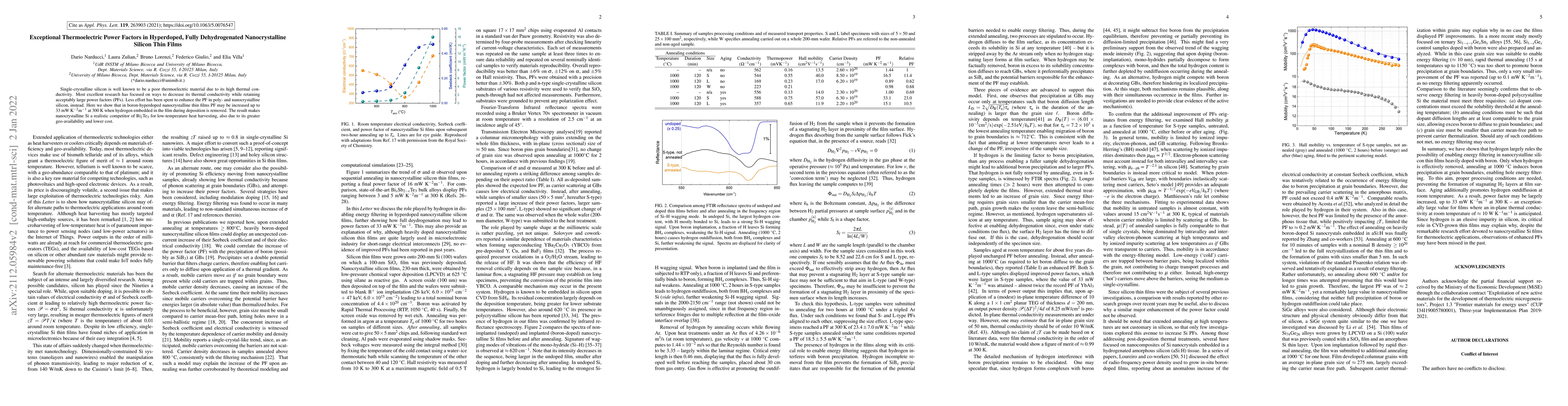 Single-crystalline silicon is well known to be a poor thermoelectric material due to its high thermal conductivity. Most excellent research has focused on ways to decrease its thermal conductivity while retaining acceptably large power factors (PFs). Less effort has been spent to enhance the PF in poly and nanocrystalline silicon, instead. Here we show that in boron-hyperdoped nanocrystalline thin films PF may be increased up to 33 mW K$^{-2}$m$^{-1}$ at 300 K when hydrogen embedded in the film during deposition is removed. The result makes nanocrystalline Si a realistic competitor of Bi$_2$Te$_3$ for low-temperature heat harvesting, also due to its greater geo-availability and lower cost.