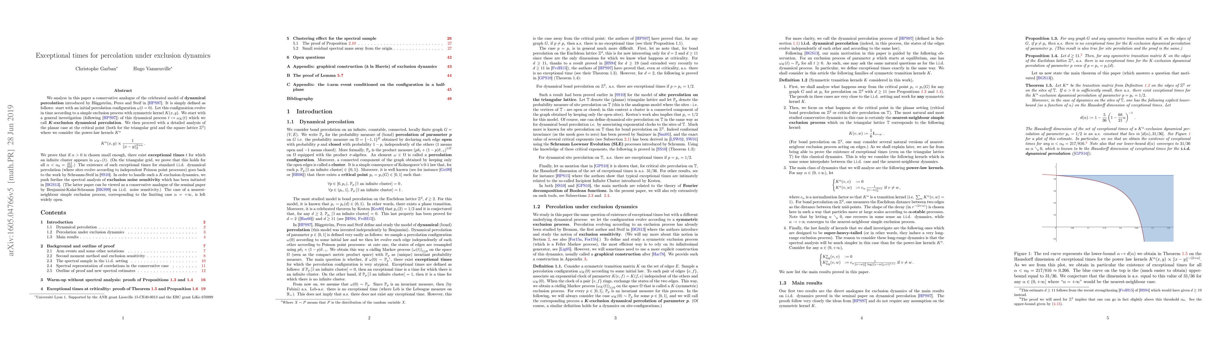 This paper investigates a conservative model of dynamical percolation evolving under exclusion dynamics, proving the existence of exceptional times where an infinite cluster appears in the system for certain power-law kernels. The study extends spectral analysis techniques to handle exclusion noise sensitivity, with specific results on the triangular grid for small positive α values.