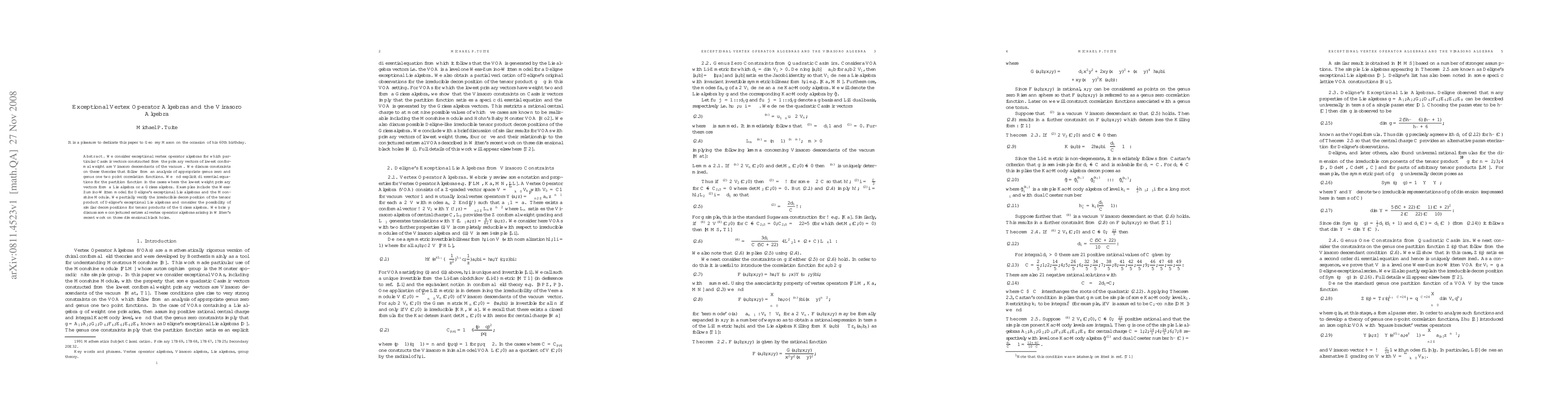 Summary: This paper explores exceptional vertex operator algebras linked to the Virasoro algebra, deriving constraints from genus zero and one correlation functions. It finds differential equations for partition functions in cases where primary vectors form Lie or Griess algebras, and discusses implications for Deligne's exceptional Lie algebras and the Moonshine Module.