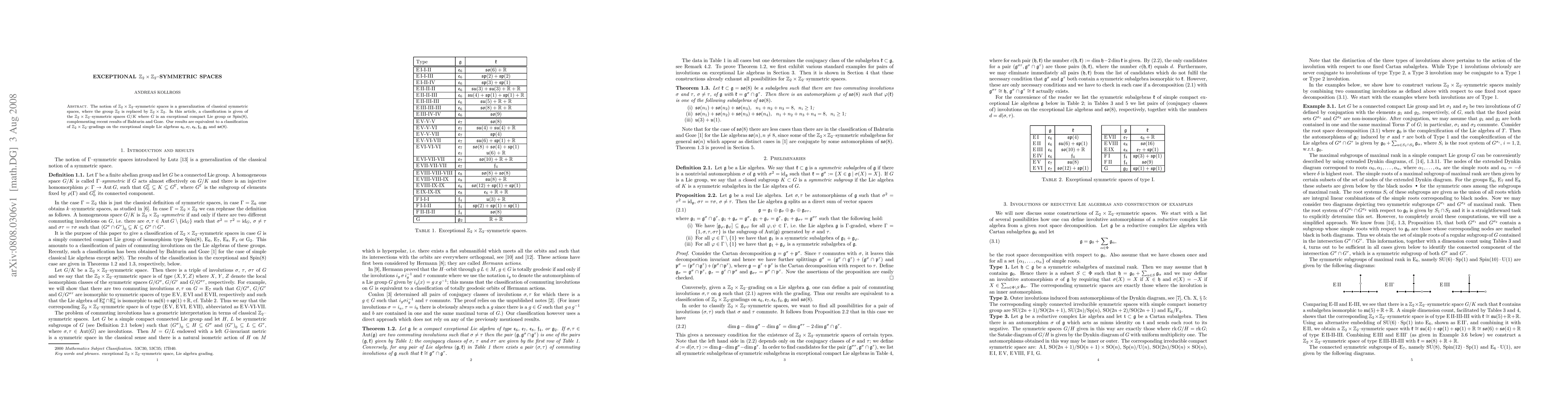 This paper classifies (Z/2Z) x (Z/2Z)-symmetric spaces associated with exceptional compact Lie groups, providing a parallel to recent work on (Z/2Z) x (Z/2Z)-gradings on exceptional simple Lie algebras. The results complement and extend previous findings by Bahturin and Goze.