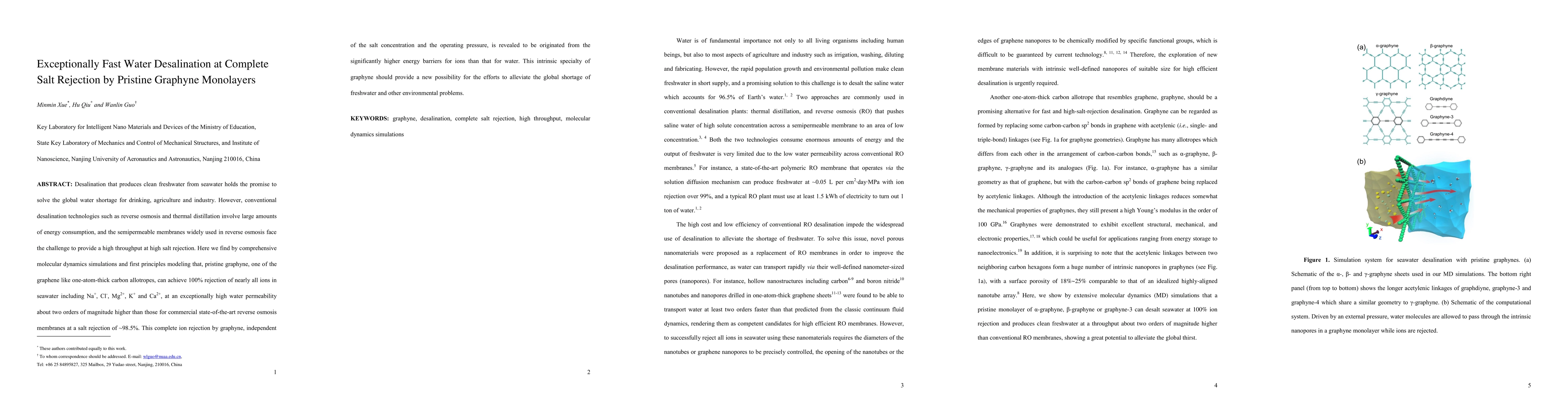 This paper demonstrates that pristine graphyne monolayers can achieve 100% salt rejection with significantly higher water permeability compared to conventional reverse osmosis membranes, offering a promising solution for desalination with minimal energy consumption. The exceptional performance is attributed to the high energy barriers for ions relative to water, suggesting potential for addressing global freshwater shortages.