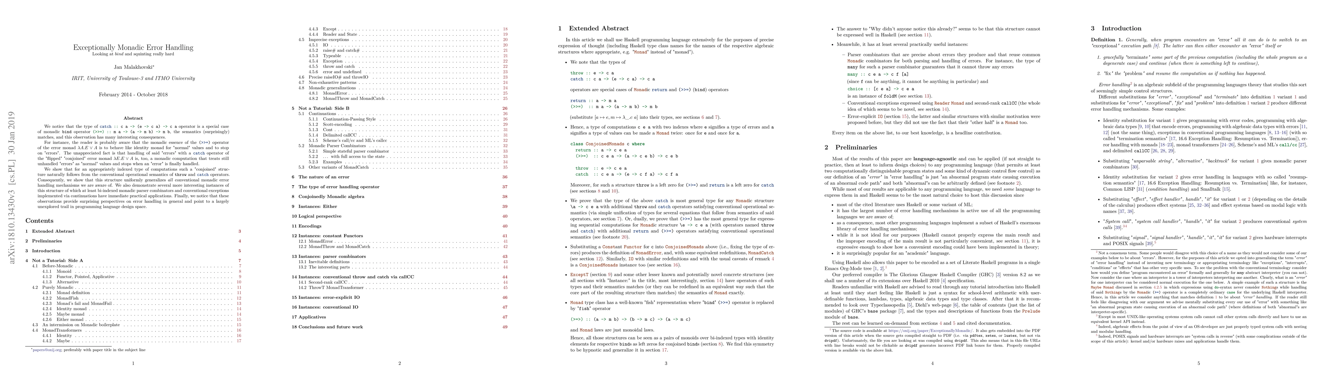We notice that the type of catch :: c a -> (e -> c a) -> c a operator is a special case of monadic bind operator (>>=) :: m a -> (a -> m b) -> m b, the semantics (surprisingly) matches, and this observation has many interesting consequences. For instance, the reader is probably aware that the monadic essence of the (>>=) operator of the error monad $\lambda A.E \lor A$ is to behave like identity monad for "normal" values and to stop on "errors". The unappreciated fact is that handling of said "errors" with a catch operator of the "flipped" "conjoined" error monad $\lambda E.E \lor A$ is, too, a monadic computation that treats still unhandled "errors" as "normal" values and stops when an "error" is finally handled. We show that for an appropriately indexed type of computations such a "conjoined" structure naturally follows from the conventional operational semantics of throw and catch operators. Consequently, we show that this structure uniformly generalizes all conventional monadic error handling mechanisms we are aware of. We also demonstrate several more interesting instances of this structure of which at least bi-indexed monadic parser combinators and conventional exceptions implemented via continuations have immediate practical applications. Finally, we notice that these observations provide surprising perspectives on error handling in general and point to a largely unexplored trail in programming language design space.