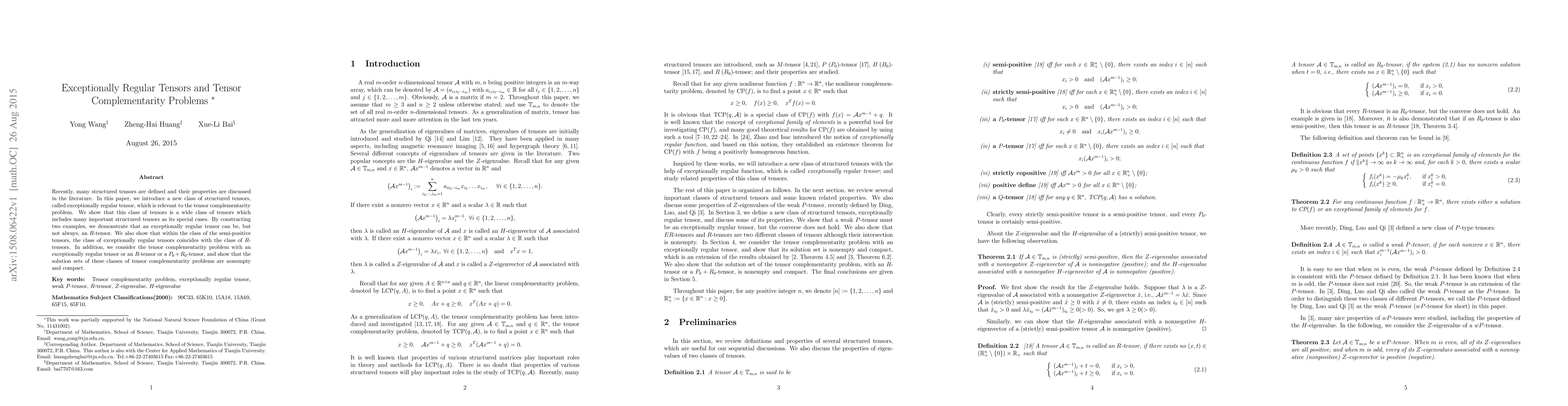 Recently, many structured tensors are defined and their properties are discussed in the literature. In this paper, we introduce a new class of structured tensors, called exceptionally regular tensor, which is relevant to the tensor complementarity problem. We show that this class of tensors is a wide class of tensors which includes many important structured tensors as its special cases. By constructing two examples, we demonstrate that an exceptionally regular tensor can be, but not always, an $R$-tensor. We also show that within the class of the semi-positive tensors, the class of exceptionally regular tensors coincides with the class of $R$-tensors. In addition, we consider the tensor complementarity problem with an exceptionally regular tensor or an $R$-tensor or a $P_0+R_0$-tensor, and show that the solution sets of these classes of tensor complementarity problems are nonempty and compact.