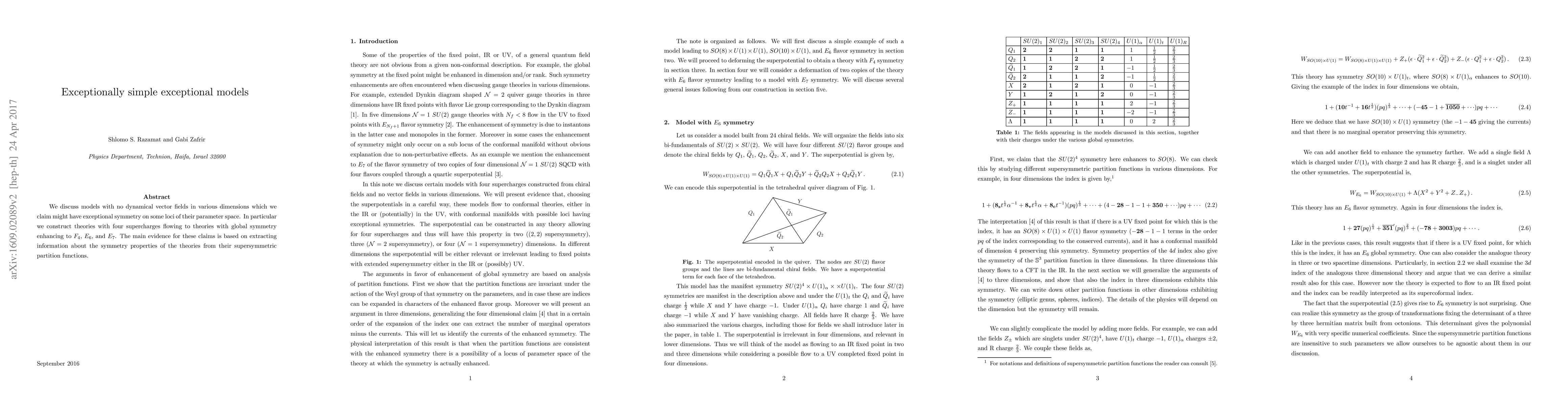 We discuss models with no dynamical vector fields in various dimensions which we claim might have exceptional symmetry on some loci of their parameter space. In particular we construct theories with four supercharges flowing to theories with global symmetry enhancing to $F_4$, $E_6$, and $E_7$. The main evidence for these claims is based on extracting information about the symmetry properties of the theories from their supersymmetric partition functions.