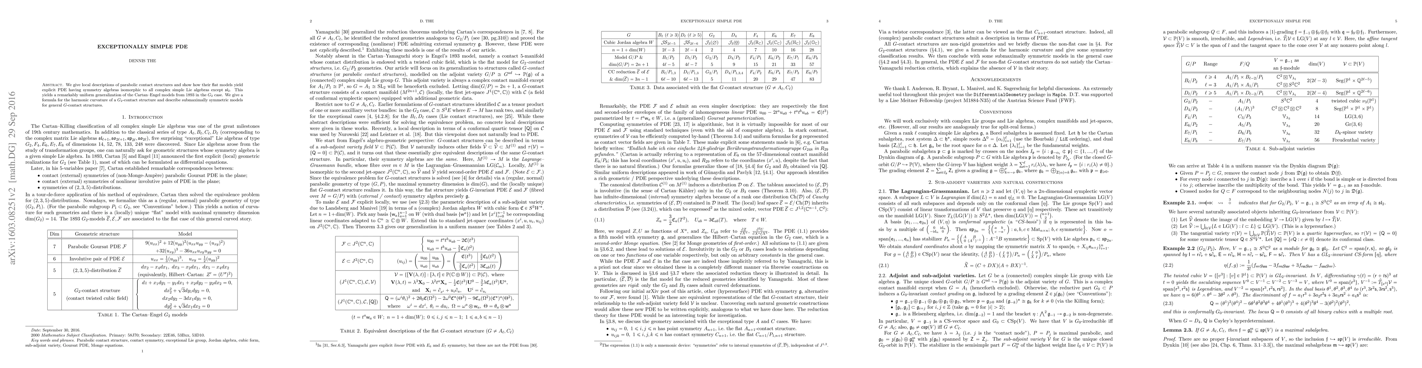 We give local descriptions of parabolic contact structures and show how their flat models yield explicit PDE having symmetry algebras isomorphic to all complex simple Lie algebras except $\mathfrak{sl}_2$. This yields a remarkably uniform generalization of the Cartan-Engel models from 1893 in the $G_2$ case. We give a formula for the harmonic curvature of a $G_2$-contact structure and describe submaximally symmetric models for general $G$-contact structures.