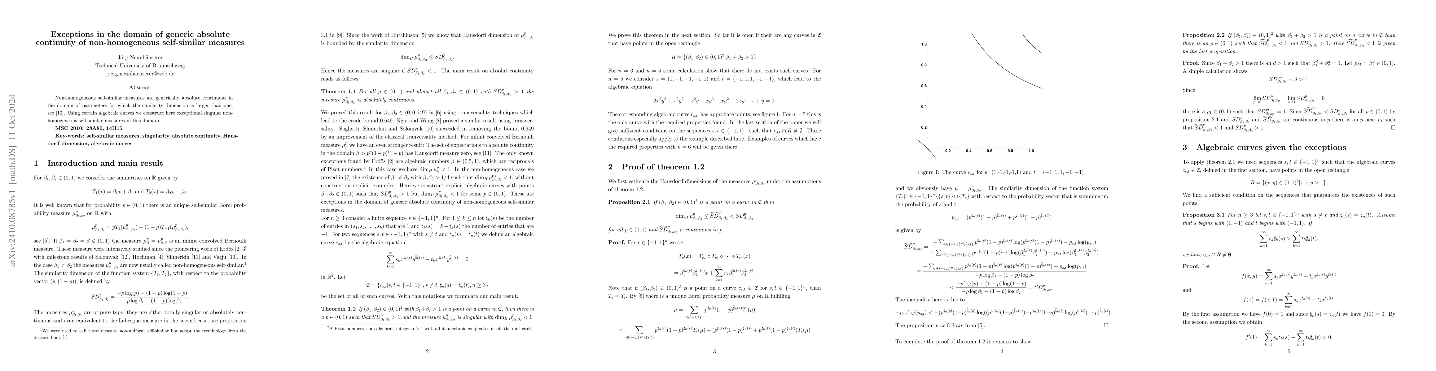 The paper discusses the generic absolute continuity of non-homogeneous self-similar measures when the similarity dimension exceeds one. It constructs exceptional singular measures using algebraic curves to demonstrate deviations from this generic behavior.