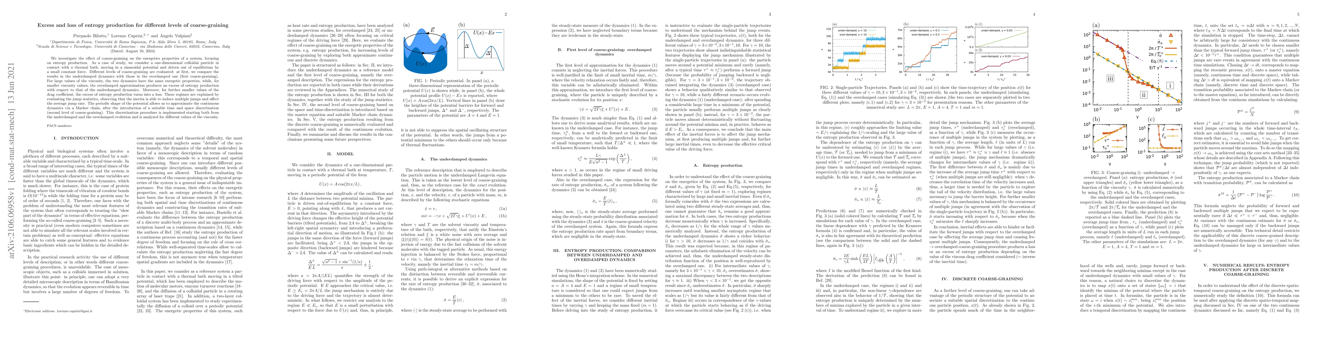 We investigate the effect of coarse-graining on the energetics properties of a system, focusing on entropy production. As a case of study, we consider a one-dimensional colloidal particle in contact with a thermal bath, moving in a sinusoidal potential and driven out of equilibrium by a small constant force. Different levels of coarse-graining are evaluated: at first, we compare the results in the underdamped dynamics with those in the overdamped one (first coarse-graining). For large values of the viscosity, the two dynamics have the same energetic properties, while, for smaller viscosity values, the overdamped approximation produces an excess of entropy production with respect to that of the underdamped dynamics. Moreover, for further smaller values of the drag coefficient, the excess of entropy production turns into a loss. These regimes are explained by evaluating the jump statistics, observing that the inertia is able to induce multiple jumps and affect the average jump rate. The periodic shape of the potential allows us to approximate the continuous dynamics via a Markov chain, after the introduction of a suitable time and space discretization (second level of coarse-graining). This discretization procedure is implemented starting both from the underdamped and the overdamped evolution and is analyzed for different values of the viscosity.