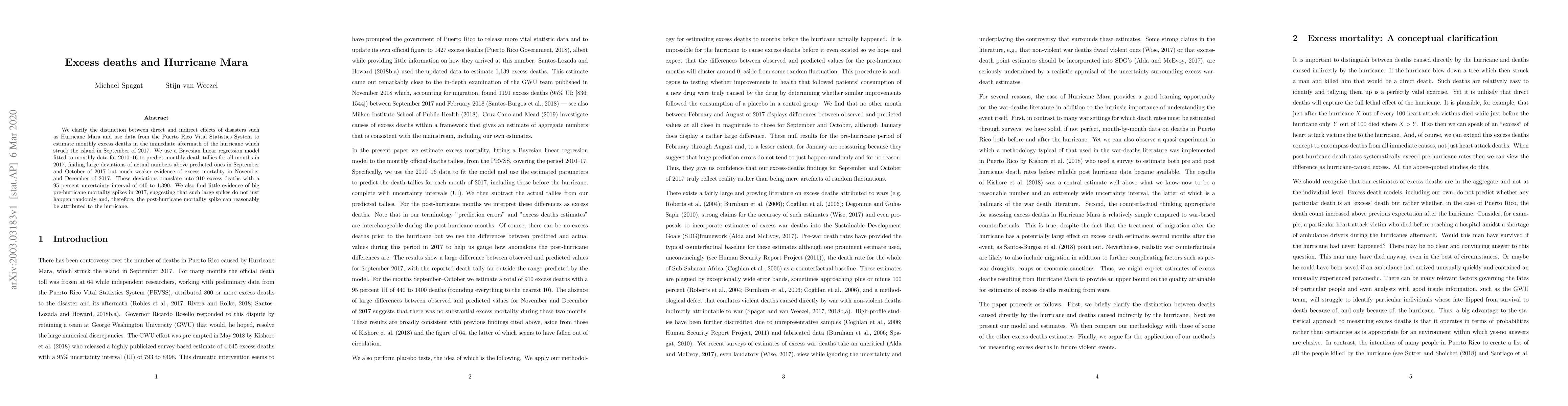 We clarify the distinction between direct and indirect effects of disasters such as Hurricane Mar\'ia and use data from the Puerto Rico Vital Statistics System to estimate monthly excess deaths in the immediate aftermath of the hurricane which struck the island in September of 2017. We use a Bayesian linear regression model fitted to monthly data for 2010--16 to predict monthly death tallies for all months in 2017, finding large deviations of actual numbers above predicted ones in September and October of 2017 but much weaker evidence of excess mortality in November and December of 2017. These deviations translate into 910 excess deaths with a 95 percent uncertainty interval of 440 to 1,390. We also find little evidence of big pre-hurricane mortality spikes in 2017, suggesting that such large spikes do not just happen randomly and, therefore, the post-hurricane mortality spike can reasonably be attributed to the hurricane.