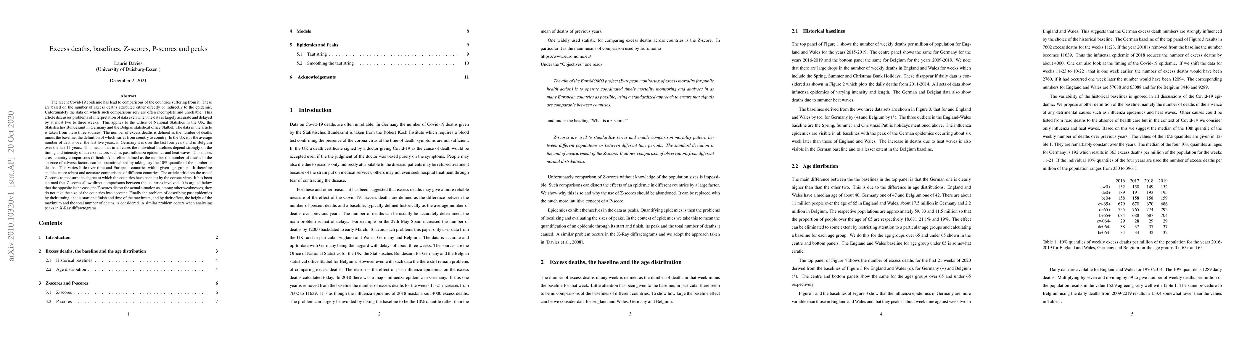 The recent Covid-19 epidemic has lead to comparisons of the countries suffering from it. These are based on the number of excess deaths attributed either directly or indirectly to the epidemic. Unfortunately the data on which such comparisons rely are often incomplete and unreliable. This article discusses problems of interpretation of data even when the data is largely accurate and delayed by at most two to three weeks. This applies to the Office of National Statistics in the UK, the Statistisches Bundesamt in Germany and the Belgian statistical office Statbel. The data in the article is taken from these three sources. The number of excess deaths is defined as the number of deaths minus the baseline, the definition of which varies from country to country. In the UK it is the average number of deaths over the last five years, in Germany it is over the last four years and in Belgium over the last 11 years. This means that in all cases the individual baselines depend strongly on the timing and intensity of adverse factors such as past influenza epidemics and heat waves. This makes cross-country comparisons difficult. A baseline defined as the number the number of deaths in the absence of adverse factors can be operationalized by taking say the 10\% quantile of the number of deaths. This varies little over time and European countries within given age groups. It therefore enables more robust and accurate comparisons of different countries. The article criticizes the use of Z-scores which distort the comparison between countries. Finally the problem of describing past epidemics by their timing, that is start and finish and time of the maximum, and by their effect, the height of the maximum and the total number of deaths, is considered.