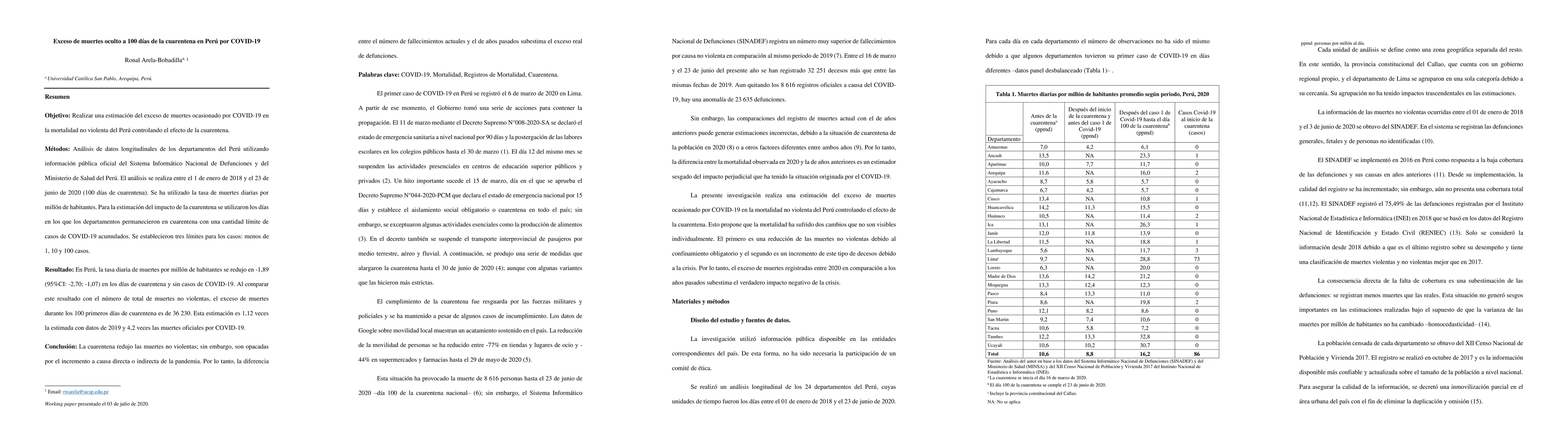 Objective: To make an estimate of the excess deaths caused by COVID-19 in the non-violent mortality of Peru, controlling for the effect of quarantine. Methods: Analysis of longitudinal data from the departments of Peru using official public information from the National Death Information System and the Ministry of Health of Peru. The analysis is performed between January 1, 2018 and June 23, 2020 (100 days of quarantine). The daily death rate per million inhabitants has been used. The days in which the departments were quarantined with a limit number of accumulated cases of COVID-19 were used to estimate the quarantine impact. Three limits were established for cases: less than 1, 10 and 100 cases. Result: In Peru, the daily death rate per million inhabitants decreased by -1.89 (95% CI: -2.70; -1.07) on quarantine days and without COVID-19 cases. When comparing this result with the total number of non-violent deaths, the excess deaths during the first 100 days of quarantine is 36,230. This estimate is 1.12 times the estimate with data from 2019 and 4.2 times the deaths officers by COVID-19. Conclusion: Quarantine reduced nonviolent deaths; however, they are overshadowed by the increase as a direct or indirect cause of the pandemic. Therefore, the difference between the number of current deaths and that of past years underestimates the real excess of deaths.