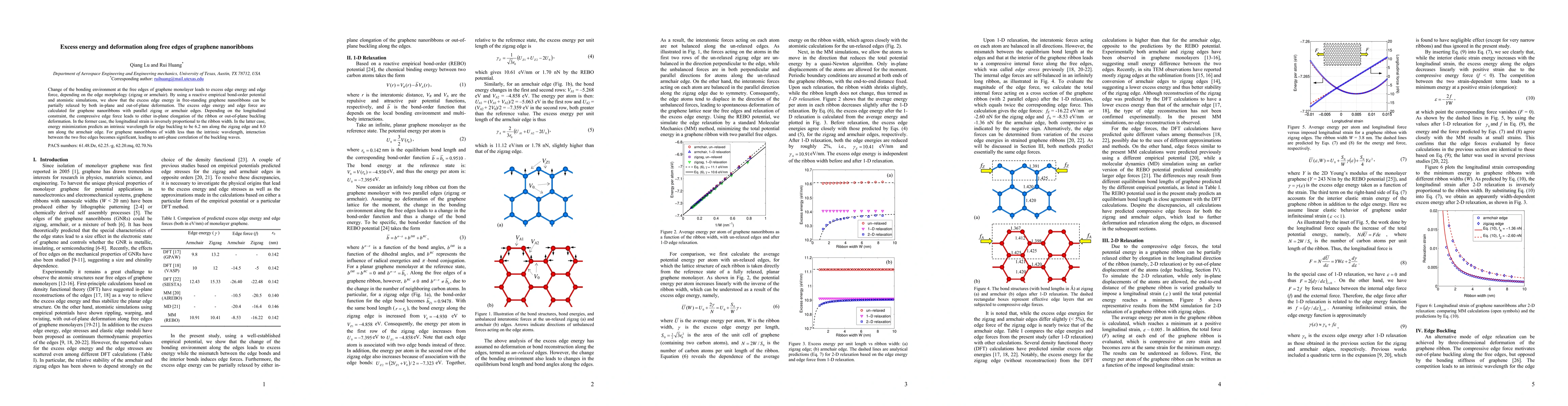 Change of the bonding environment at the free edges of graphene monolayer leads to excess edge energy and edge force, depending on the edge morphology (zigzag or armchair). By using a reactive empirical bond-order potential and atomistic simulations, we show that the excess edge energy in free-standing graphene nanoribbons can be partially relaxed by both in-plane and out-of-plane deformation. The excess edge energy and edge force are calculated for graphene nanoribbons with parallel zigzag or armchair edges. Depending on the longitudinal constraint, the compressive edge force leads to either in-plane elongation of the ribbon or out-of-plane buckling deformation. In the former case, the longitudinal strain is inversely proportional to the ribbon width. In the latter case, energy minimization predicts an intrinsic wavelength for edge buckling to be 6.2 nm along the zigzag edge and 8.0 nm along the armchair edge. For graphene nanoribbons of width less than the intrinsic wavelength, interaction between the two free edges becomes significant, leading to anti-phase correlation of the buckling waves.