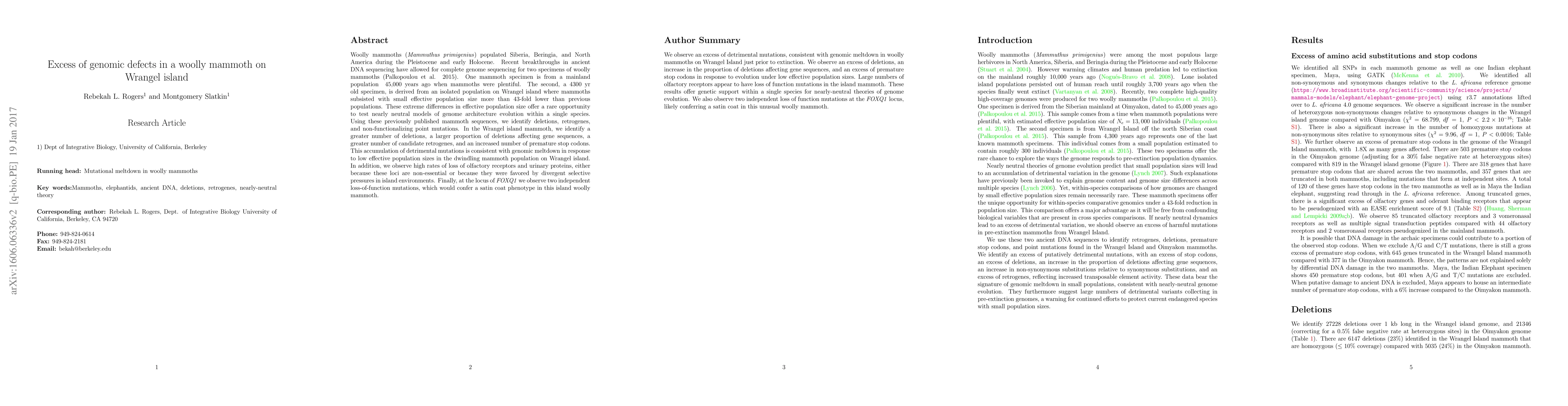 Woolly mammoths (Mammuthus primigenius) populated Siberia, Beringia, and North America during the Pleistocene and early Holocene. Recent breakthroughs in ancient DNA sequencing have allowed for complete genome sequencing for two specimens of woolly mammoths (Palkopoulou et al. 2015). One mammoth specimen is from a mainland population ~45,000 years ago when mammoths were plentiful. The second, a 4300 yr old specimen, is derived from an isolated population on Wrangel island where mammoths subsisted with small effective population size more than 43-fold lower than previous populations. These extreme differences in effective population size offer a rare opportunity to test nearly neutral models of genome architecture evolution within a single species. Using these previously published mammoth sequences, we identify deletions, retrogenes, and non-functionalizing point mutations. In the Wrangel island mammoth, we identify a greater number of deletions, a larger proportion of deletions affecting gene sequences, a greater number of candidate retrogenes, and an increased number of premature stop codons. This accumulation of detrimental mutations is consistent with genomic meltdown in response to low effective population sizes in the dwindling mammoth population on Wrangel island. In addition, we observe high rates of loss of olfactory receptors and urinary proteins, either because these loci are non-essential or because they were favored by divergent selective pressures in island environments. Finally, at the locus of FOXQ1 we observe two independent loss-of-function mutations, which would confer a satin coat phenotype in this island woolly mammoth.
