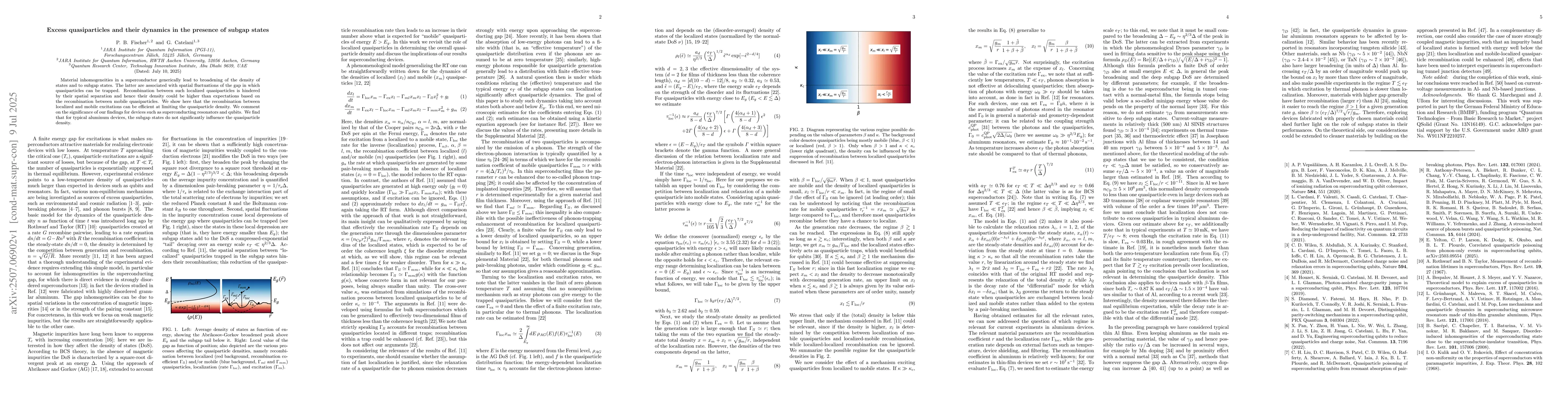 Material inhomogeneities in a superconductor generically lead to broadening of the density of states and to subgap states. The latter are associated with spatial fluctuations of the gap in which quasiparticles can be trapped. Recombination between such localized quasiparticles is hindered by their spatial separation and hence their density could be higher than expectations based on the recombination between mobile quasiparticles. We show here that the recombination between localized and mobile excitations can be efficient at limiting the quasiparticle density. We comment on the significance of our findings for devices such as superconducting resonators and qubits. We find that for typical aluminum devices, the subgap states do not significantly influence the quasiparticle density.