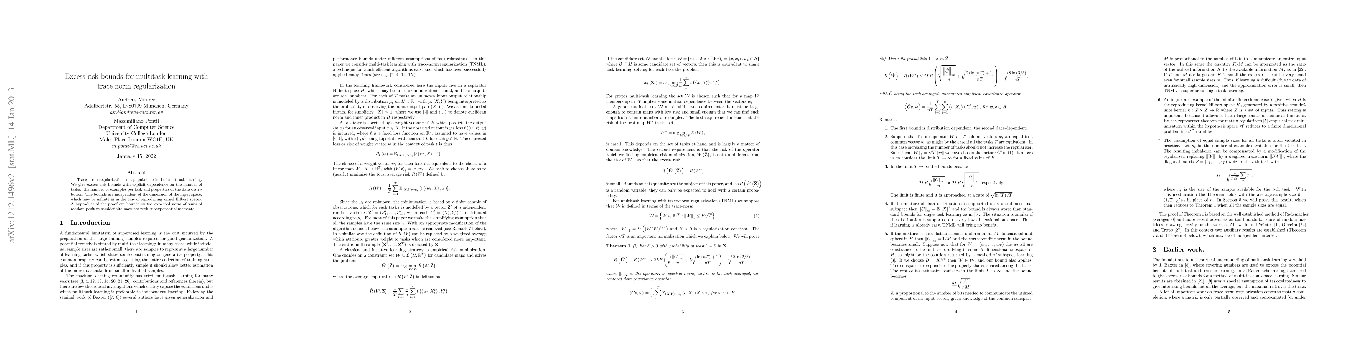 This paper provides excess risk bounds for multitask learning using trace norm regularization, showing explicit dependence on task and example counts, and data distribution properties. Notably, the bounds are dimension-independent, even for infinite-dimensional input spaces.