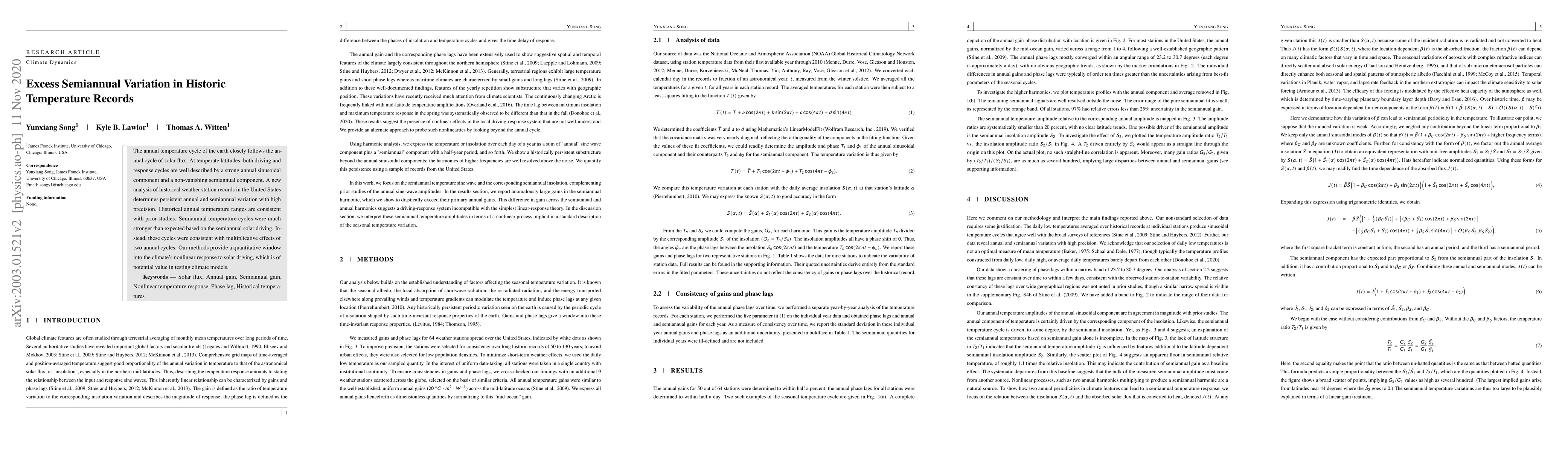 The annual temperature cycle of the earth closely follows the annual cycle of solar flux. At temperate latitudes, both driving and response cycles are well described by a strong annual sinusoidal component and a non-vanishing semiannual component. A new analysis of historical weather station records in the United States determines persistent annual and semiannual variation with high precision. Historical annual temperature ranges are consistent with prior studies. Semiannual temperature cycles were much stronger than expected based on the semiannual solar driving. Instead, these cycles were consistent with multiplicative effects of two annual cycles. Our methods provide a quantitative window into the climate's nonlinear response to solar driving, which is of potential value in testing climate models.