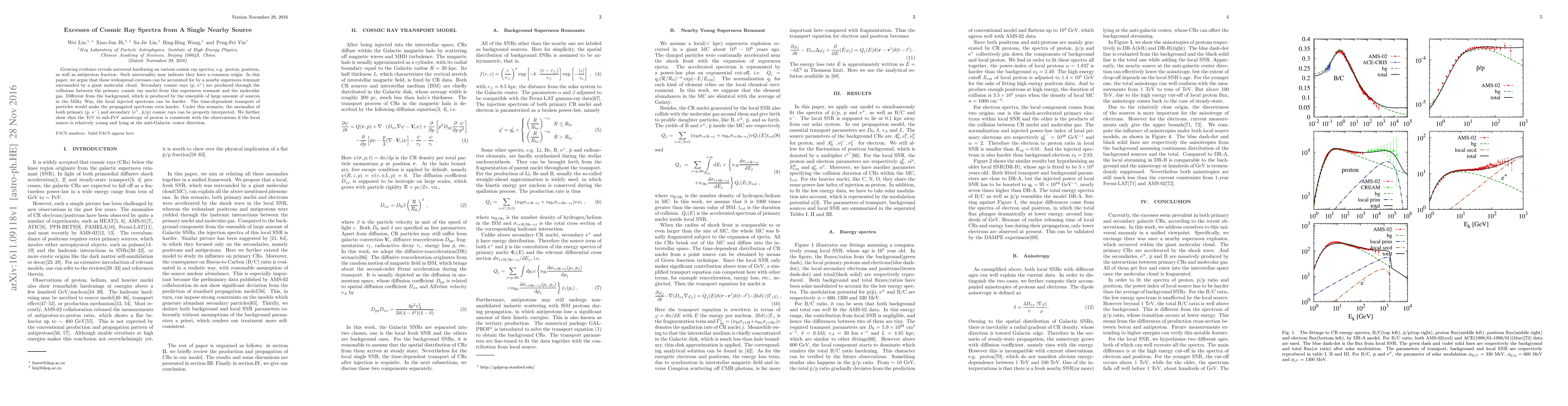 Growing evidence reveals universal hardening on various cosmic ray spectra, e.g. proton, positron, as well as antiproton fraction. Such universality may indicate they have a common origin. In this paper, we argue that these widespread excesses can be accounted for by a nearby supernova remnant surrounded by a giant molecular cloud. Secondary cosmic rays ($\rm p$, $\rm e^+$) are produced through the collisions between the primary cosmic ray nuclei from this supernova remnant and the molecular gas. Different from the background, which is produced by the ensemble of large amount of sources in the Milky Way, the local injected spectrum can be harder. The time-dependent transport of particles would make the propagated spectrum even harder. Under this scenario, the anomalies of both primary ($\rm p$, $\rm e^-$) and secondary ($\rm e^+$, $\rm \bar{p}/p$) cosmic rays can be properly interpreted. We further show that the TeV to sub-PeV anisotropy of proton is consistent with the observations if the local source is relatively young and lying at the anti-Galactic center direction.
