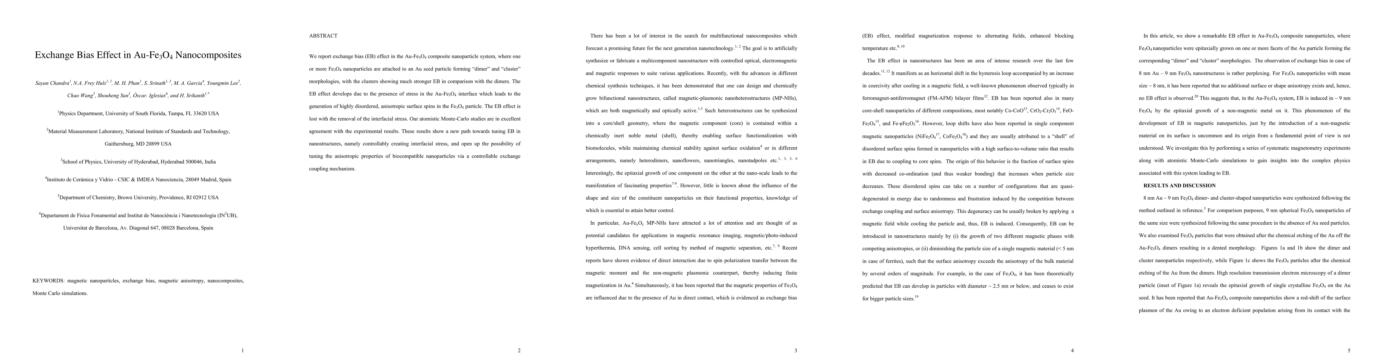 We report exchange bias (EB) effect in the Au-Fe3O4 composite nanoparticle system, where one or more Fe3O4 nanoparticles are attached to an Au seed particle forming dimer and cluster morphologies, with the clusters showing much stronger EB in comparison with the dimers. The EB effect develops due to the presence of stress in the Au-Fe3O4 interface which leads to the generation of highly disordered, anisotropic surface spins in the Fe3O4 particle. The EB effect is lost with the removal of the interfacial stress. Our atomistic Monte-Carlo studies are in excellent agreement with the experimental results. These results show a new path towards tuning EB in nanostructures, namely controllably creating interfacial stress, and open up the possibility of tuning the anisotropic properties of biocompatible nanoparticles via a controllable exchange coupling mechanism.