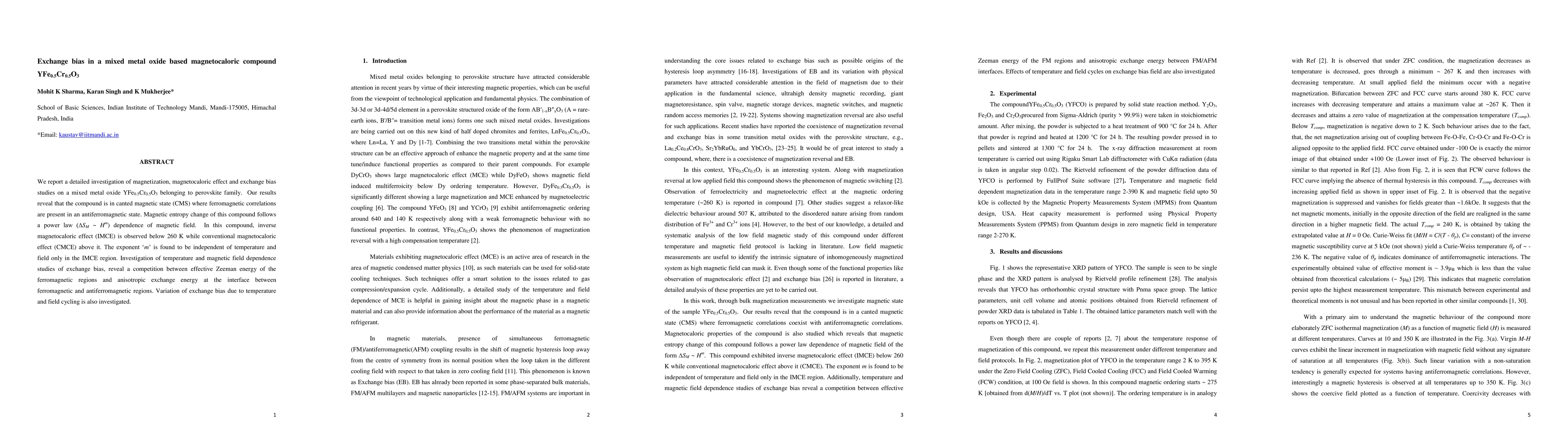 We report a detailed investigation of magnetization, magnetocaloric effect and exchange bias studies on a mixed metal oxide YFe0.5Cr0.5O3 belonging to perovskite family. Our results reveal that the compound is in canted magnetic state (CMS) where ferromagnetic correlations are present in an antiferromagnetic state. Magnetic entropy change of this compound follows a power law (deltaS_M ~ H^m) dependence of magnetic field. In this compound, inverse magnetocaloric effect (IMCE) is observed below 260 K while conventional magnetocaloric effect (CMCE) above it. The exponent m is found to be independent of temperature and field only in the IMCE region. Investigation of temperature and magnetic field dependence studies of exchange bias, reveal a competition between effective Zeeman energy of the ferromagnetic regions and anisotropic exchange energy at the interface between ferromagnetic and antiferromagnetic regions. Variation of exchange bias due to temperature and field cycling is also investigated.