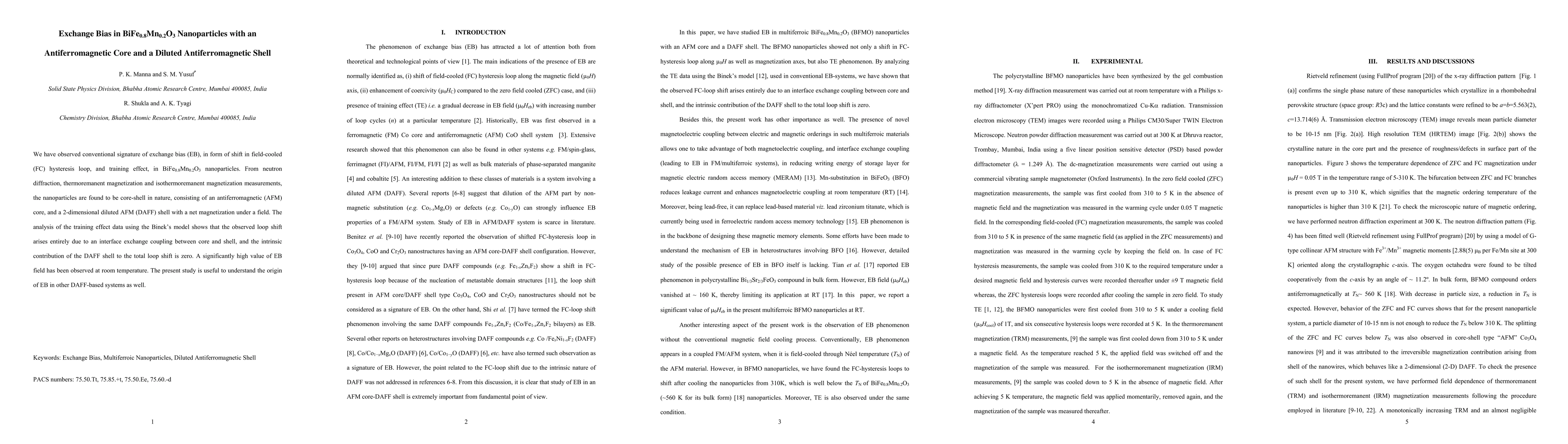 We have observed conventional signature of exchange bias (EB), in form of shift in field-cooled (FC) hysteresis loop, and training effect, in BiFe0.8Mn0.2O3 nanoparticles. From neutron diffraction, thermoremanent magnetization and isothermoremanent magnetization measurements, the nanoparticles are found to be core-shell in nature, consisting of an antiferromagnetic (AFM) core, and a 2-dimensional diluted AFM (DAFF) shell with a net magnetization under a field. The analysis of the training effect data using the Binek's model shows that the observed loop shift arises entirely due to an interface exchange coupling between core and shell, and the intrinsic contribution of the DAFF shell to the total loop shift is zero. A significantly high value of EB field has been observed at room temperature. The present study is useful to understand the origin of EB in other DAFF-based systems as well.