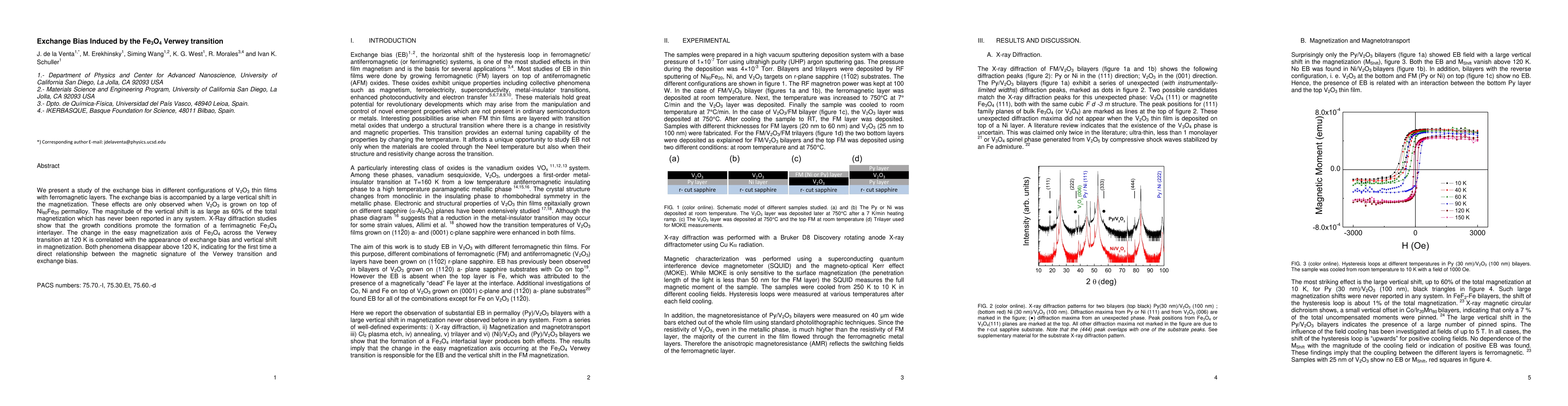 This study investigates the exchange bias in V2O3 thin films with ferromagnetic layers, revealing a significant vertical shift in magnetization when grown on Ni80Fe20. The effects are linked to the formation of a ferrimagnetic Fe3O4 interlayer, with the exchange bias and vertical shift disappearing above the Fe3O4 Verwey transition temperature of 120 K, establishing a direct relationship between the Verwey transition and exchange bias.