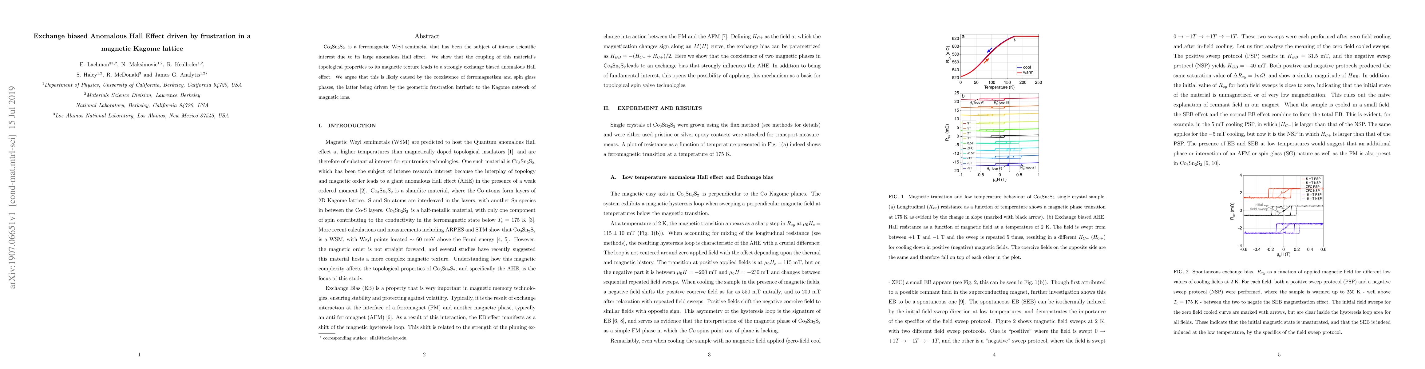 Summary: Co3Sn2S2 exhibits a large anomalous Hall effect due to its topological properties and magnetic texture, which is strongly exchange biased. This effect is attributed to the interplay between ferromagnetism and spin glass phases induced by geometric frustration in its Kagome lattice structure.