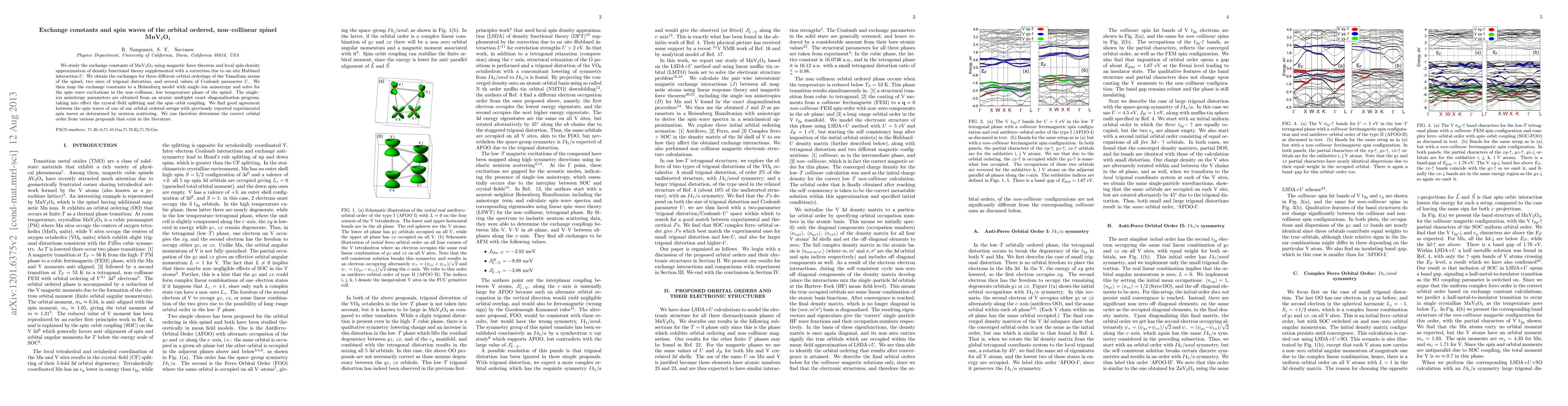 We study the exchange constants of MnV$_2$O$_4$ using magnetic force theorem and local spin density approximation of density functional theory supplemented with a correction due to on-site Hubbard interaction U. We obtain the exchanges for three different orbital orderings of the Vanadium atoms of the spinel. We then map the exchange constants to a Heisenberg model with single-ion anisotropy and solve for the spin-wave excitations in the non-collinear, low temperature phase of the spinel. The single-ion anisotropy parameters are obtained from an atomic multiplet exact-diagonalization program, taking into effect the crystal-field splitting and the spin-orbit coupling. We find good agreement between the spin waves of one of our orbital ordered setups with previously reported experimental spin waves as determined by neutron scattering. We can therefore determine the correct orbital order from various proposals that exist in the literature.