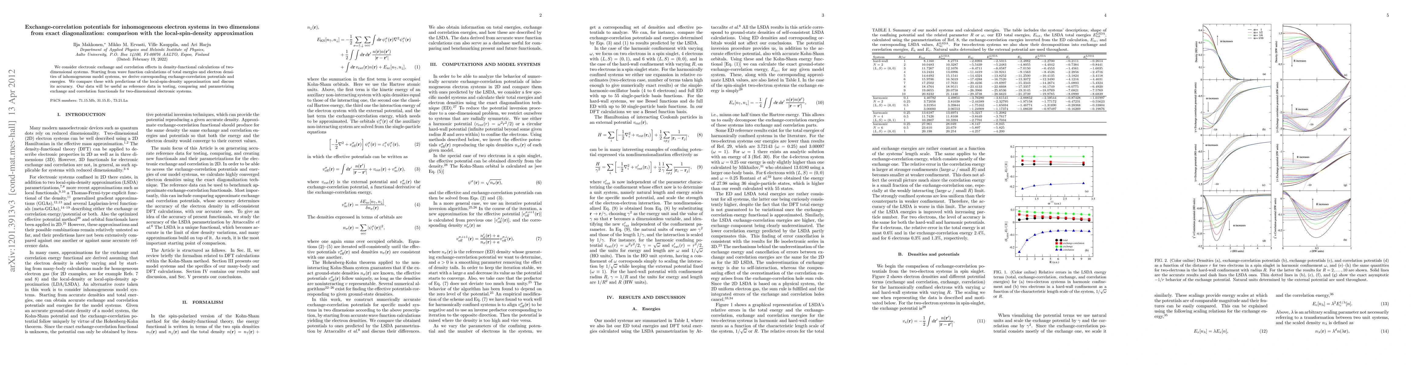 This paper derives exact exchange-correlation potentials for two-dimensional inhomogeneous electron systems using exact diagonalization and compares them with local-spin-density approximation predictions, providing reference data for testing and improving exchange-correlation functionals.