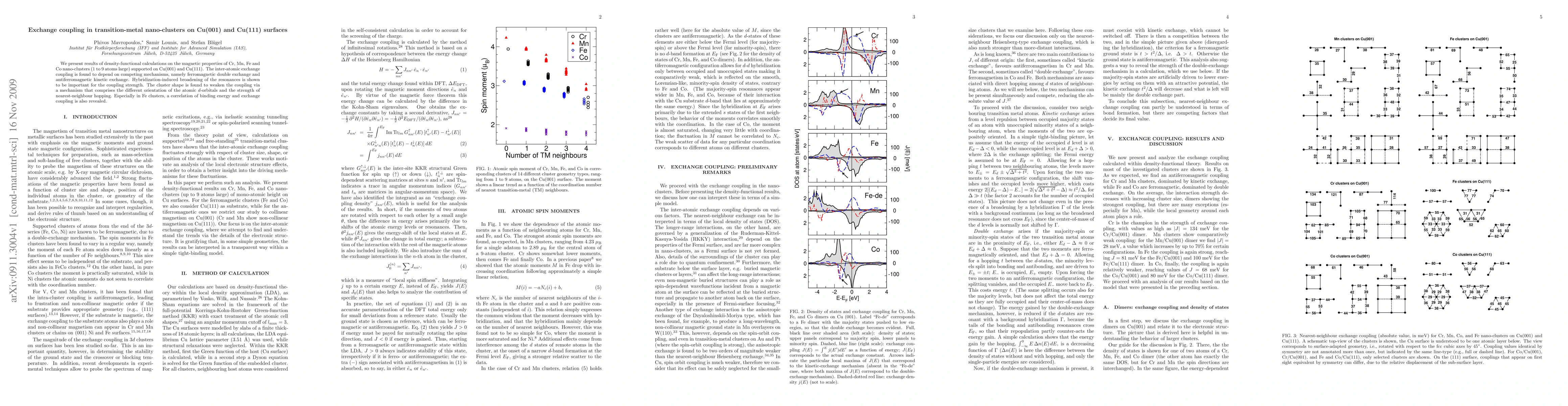 We present results of density-functional calculations on the magnetic properties of Cr, Mn, Fe and Co nano-clusters (1 to 9 atoms large) supported on Cu(001) and Cu(111). The inter-atomic exchange coupling is found to depend on competing mechanisms, namely ferromagnetic double exchange and antiferromagnetic kinetic exchange. Hybridization-induced broadening of the resonances is shown to be important for the coupling strength. The cluster shape is found to weaken the coupling via a mechanism that comprises the different orientation of the atomic d-orbitals and the strength of nearest-neighbour hopping. Especially in Fe clusters, a correlation of binding energy and exchange coupling is also revealed.