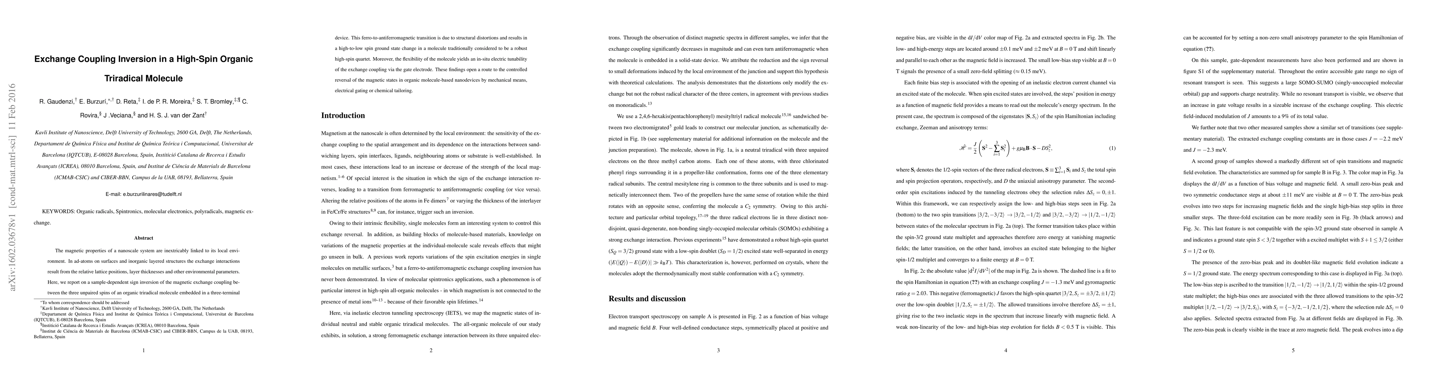 Researchers observed a sign inversion in magnetic exchange coupling between spins of an organic triradical molecule, demonstrating ferro-to-antiferromagnetic transition via structural distortions or electrical gating.
